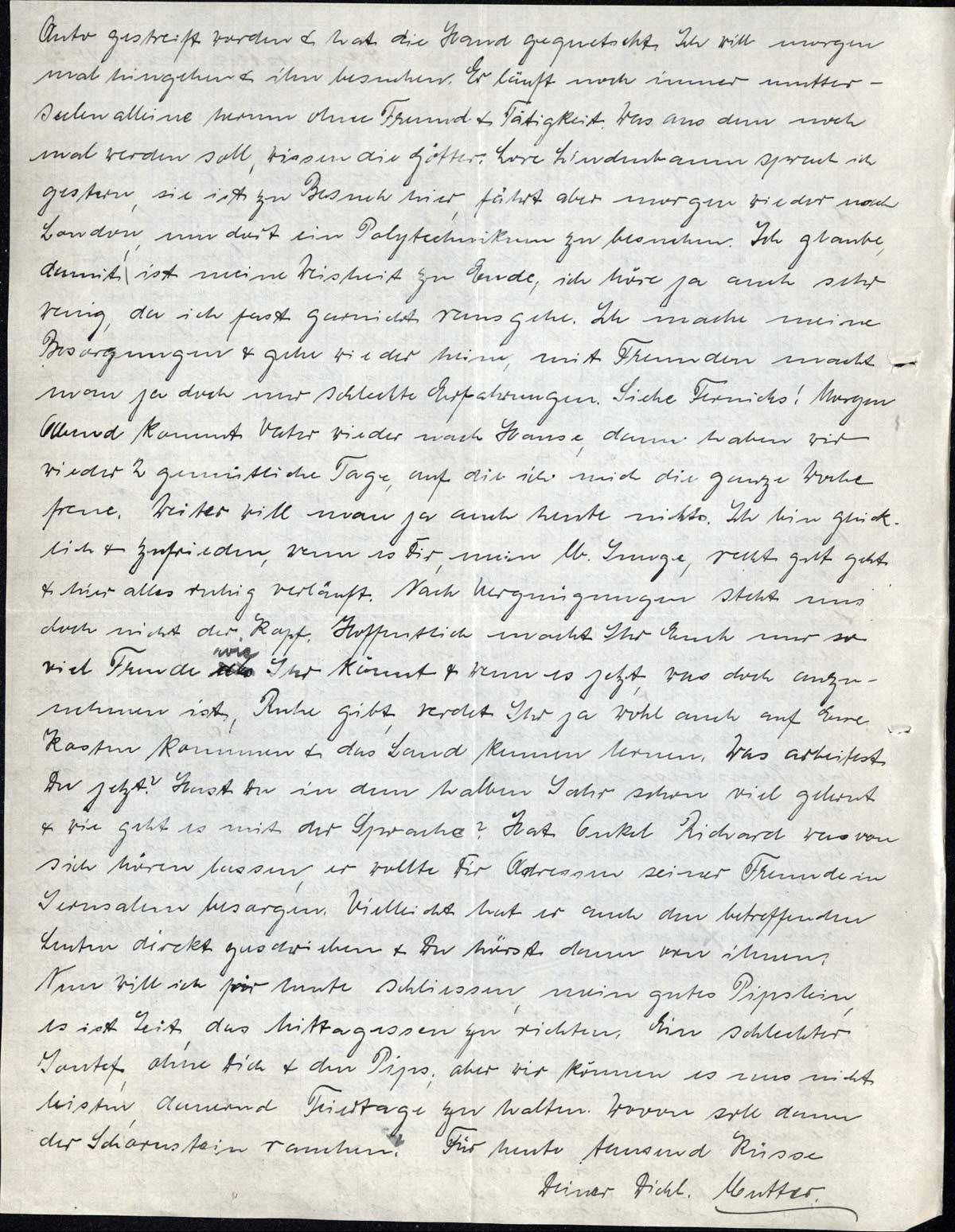 Auto gestreift worden & hat die Hand gequetscht. Ich will morgen mal hingehen & ihn besuchen. Er läuft noch immer mutterseelenalleine herum ohne Freunde & Tätigkeit. Was aus dem noch mal werden soll, wissen die Götter. Lore Lindenbaum sprach ich gestern, sie ist zu Besuch hier, fährt aber morgen wieder nach London, um dort ein Polytechnikum zu besuchen. Ich glaube, damit ist meine Weisheit zu Ende, ich höre ja auch sehr wenig, da ich fast garnicht rausgehe. Ich mache meine Besorgungen & gehe wieder heim, mit Fremden macht man ja doch nur schlechte Erfahrungen. Siehe Fernichs! Morgen Abend kommt Vater wieder nach Hause, dann haben wir wieder 2 gemütliche Tage, auf die ich mich die ganze Woche freue. Weiter will man ja auch heute nichts. Ich bin glücklich & zufrieden, wenn es Dir, mein lb. Junge, recht gut geht & hier alles ruhig verläuft. Nach Vergnügungen steht uns doch nicht der Kopf. Hoffentlich macht Ihr Euch nur so viel Freude wie Ihr könnt & wenn es jetzt, was doch anzunehmen ist, Ruhe gibt, werdet Ihr ja wohl auch auf Eure Kosten kommen & das Land kennen lernen. Was arbeitest Du jetzt? Hast Du in dem halben Jahr schon viel gelernt & wie geht es mit der Sprache? Hat Onkel Richard was von sich hören lassen, er wollte Dir Adressen seiner Freunde in Jerusalem besorgen. Vielleicht hat er auch den betreffenden Leuten direkt geschrieben & Du hörst dann von ihnen.