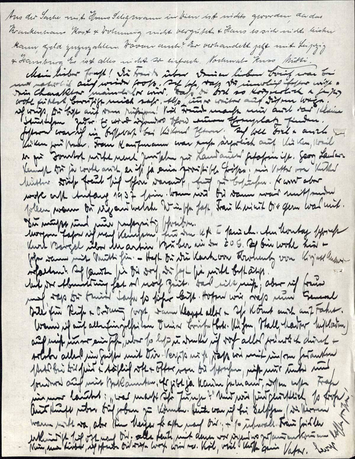 Aus der Sache mit Hans Seligmann in Wien ist nichts geworden, da das Krankenhaus Kost & Wohnung nicht vergütet & Hans es sich nicht leisten kann, Geld zuzuzahlen. Wovon auch? Er verhandelt jetzt mit Leipzig & Hamburg. Es ist alles nicht so einfach. Nochmals Kuss Mutti.