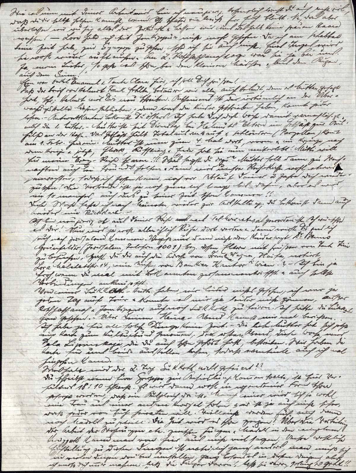 Mein lb. Junge! Viel Dank für Deinen lb. & langen Brief. Ich freue mich! Was sagst Du dazu, dass ich wieder bei Spiro an der Kasse bin. Wie lange es dauert, weiss ich nicht, aber so lange sie mich behalten wollen, halte ich aus & tue mein verdientes Geld in die Reisekasse, damit Vater Dich s. G. w. nächstes Jahr einmal besuchen kann. Dafür will ich gerne arbeiten. Es macht mir aber auch Spass. Und vor Weihnachten gehe zu Freunds aushelfen, das sind alles Marken, die ich sonst nicht habe & hoffentlich für die Reise verwandt werden können. Wir möchten ja beide kommen, aber das sind Schlösser, die im Monde liegen. Ich bin froh, wenn einer