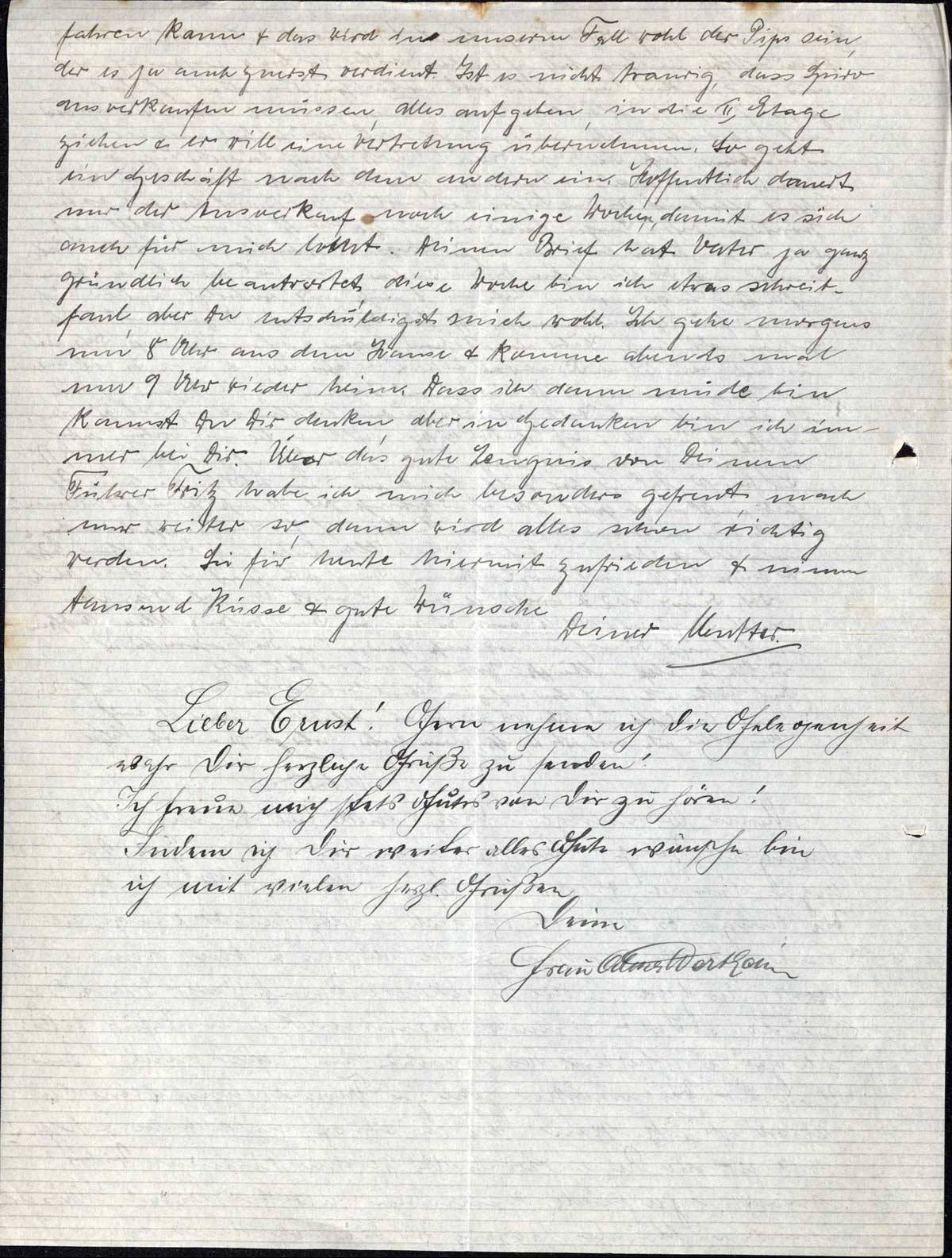 Das Gerücht, das sich hier hielt, scheint nun im Erlöschen zu sein. Ich habe nichts mehr gehört. Wer es aufgebracht hat, ist nicht herauszubekommen. Dank auch an Deinen Führer, dem Mutter & ich für seine Aufsicht danken & vielmals grüßen! - Auch an Küken & Ilse Grüße! Auch Frau Wertheim läßt Dir Grüße bestellen. Auch Georg Kaufmann, den ich heute sprach. Er ist noch a. d. Schule!