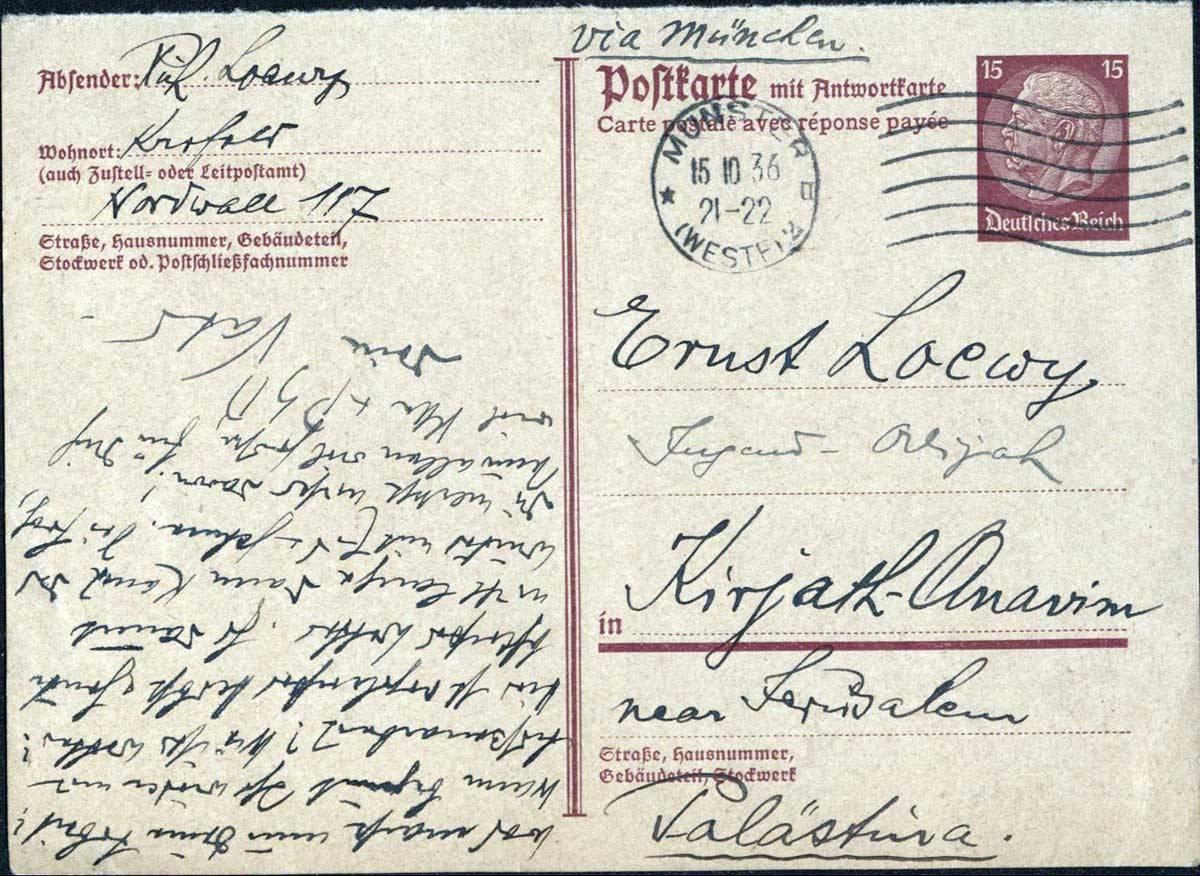 Mein lieber Junge! Damit Du diese Woche nicht wieder zu kurz kommst, eine Karte. Wie Du siehst, bin ich in Münster, gestern war Ausstellung mit ganz gutem Erfolg. Auch sonst geht es geschäftlich ungewohnt gut & zufriedenstellend. Und sonst wollen wir nicht klagen, wir sind gesund & wohl & hoffen ein Gleiches von Dir. Ich hoffe, daß mich die l. Mutter morgen Abend wieder mit Deinem Brief empfängt. Nun scheint es bei Euch ja endlich zur Ruhe zu kommen & dann werdet Ihr bald auf Fahrt kommen & in die Stadt & hoffentlich schöne Tage. Endlich könnt Ihr dann etwas vom Lande Erez sehen & auch mal Bekannte treffen. In Jerusalem ist, wie mir Dr. Bluhm sagte, auch Dr. Löwenthal, der frühere Rechtsanwalt & hat dort eine Reitschule. Wenn Du ihn mal besuchen wolltest, er würde sich bestimmt freuen. Wir waren ja mal sehr gut bekannt. - Gestern war auch Maurer hier, er fragte nach Dir. -