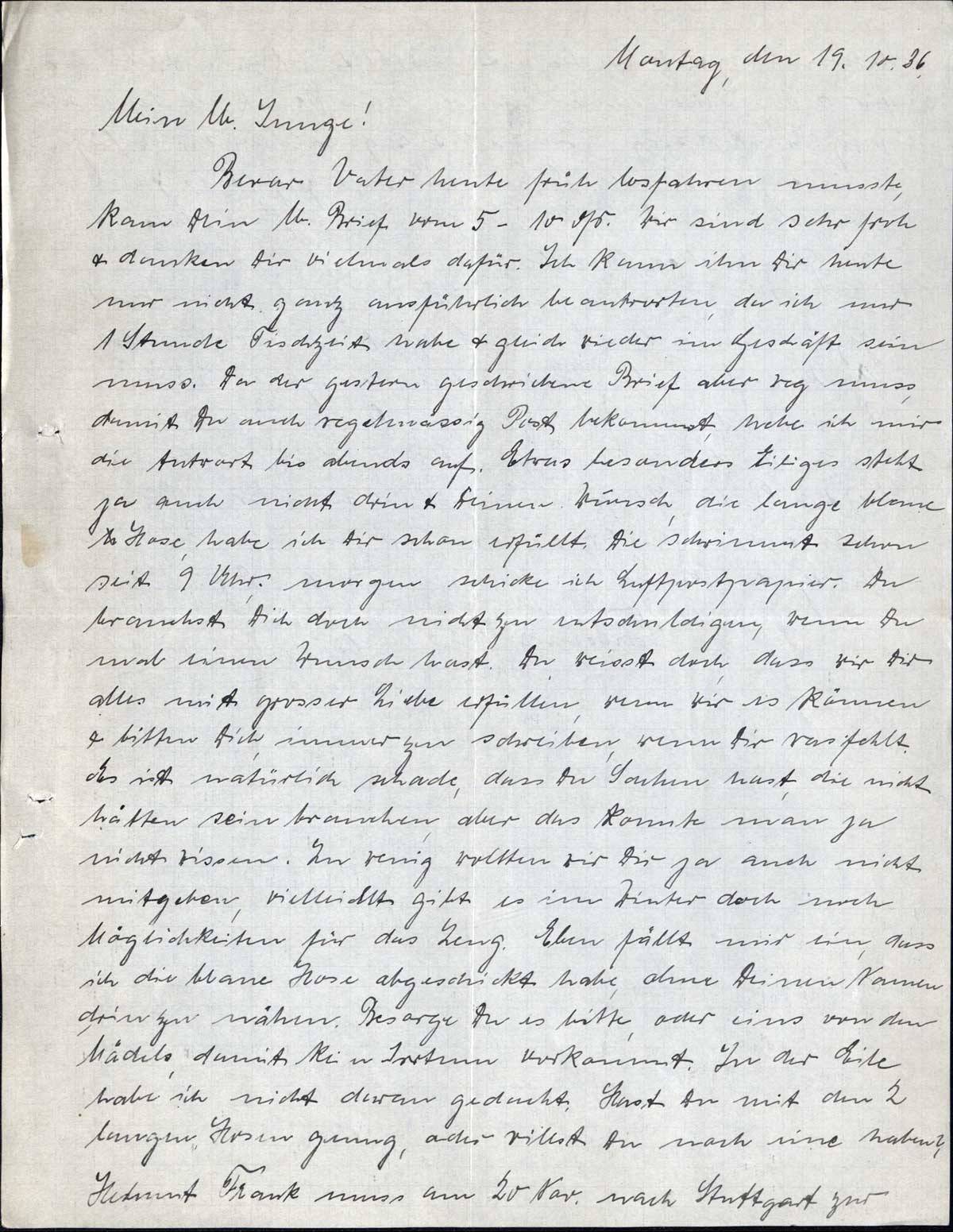 Bevor Vater heute früh losfahren musste, kam Dein Brief vom 5-10 ds. Wir sind sehr froh & danken Dir vielmals dafür. Ich kann ihn Dir heute nur nicht ganz ausführlich beantworten, da ich nur 1 Stunde Tischzeit habe & gleich wieder im Geschäft sein muss. Da der gestern geschriebene Brief aber weg muss, damit Du auch regelmässig Post bekommst, hebe ich mir die Antwort bis abends auf. Etwas besonders Eiliges steht ja auch nicht drin & Deinen Wunsch, die lange blaue Hose habe ich Dir schon erfüllt. Die schwimmt schon seit 9 Uhr; morgen schicke ich Luftpostpapier. Du brauchst Dich doch nicht zu entschuldigen, wenn Du mal einen Wunsch hast. Du weisst doch, dass wir Dir alles mit grosser Liebe erfüllen, wenn wir es können & bitten Dich, immer zu schreiben, wenn Dir was fehlt. Es ist natürlich schade, dass Du Sachen hast, die nicht hätten sein brauchen, aber das konnte man ja nicht wissen. Zu wenig wollten wir Dir ja auch nicht mitgeben, vielleicht gibt es im Winter doch noch Möglichkeiten für das Zeug. Eben fällt mir ein, dass ich die blaue Hose abgeschickt habe, ohne Deinen Namen drin zu nähen. Besorge Du es bitte, oder eins von den Mädels, damit kein Irrtum vorkommt. In der Eile habe ich nicht daran gedacht. Hast Du mit den 2 langen Hosen genug, oder willst Du noch eine haben?