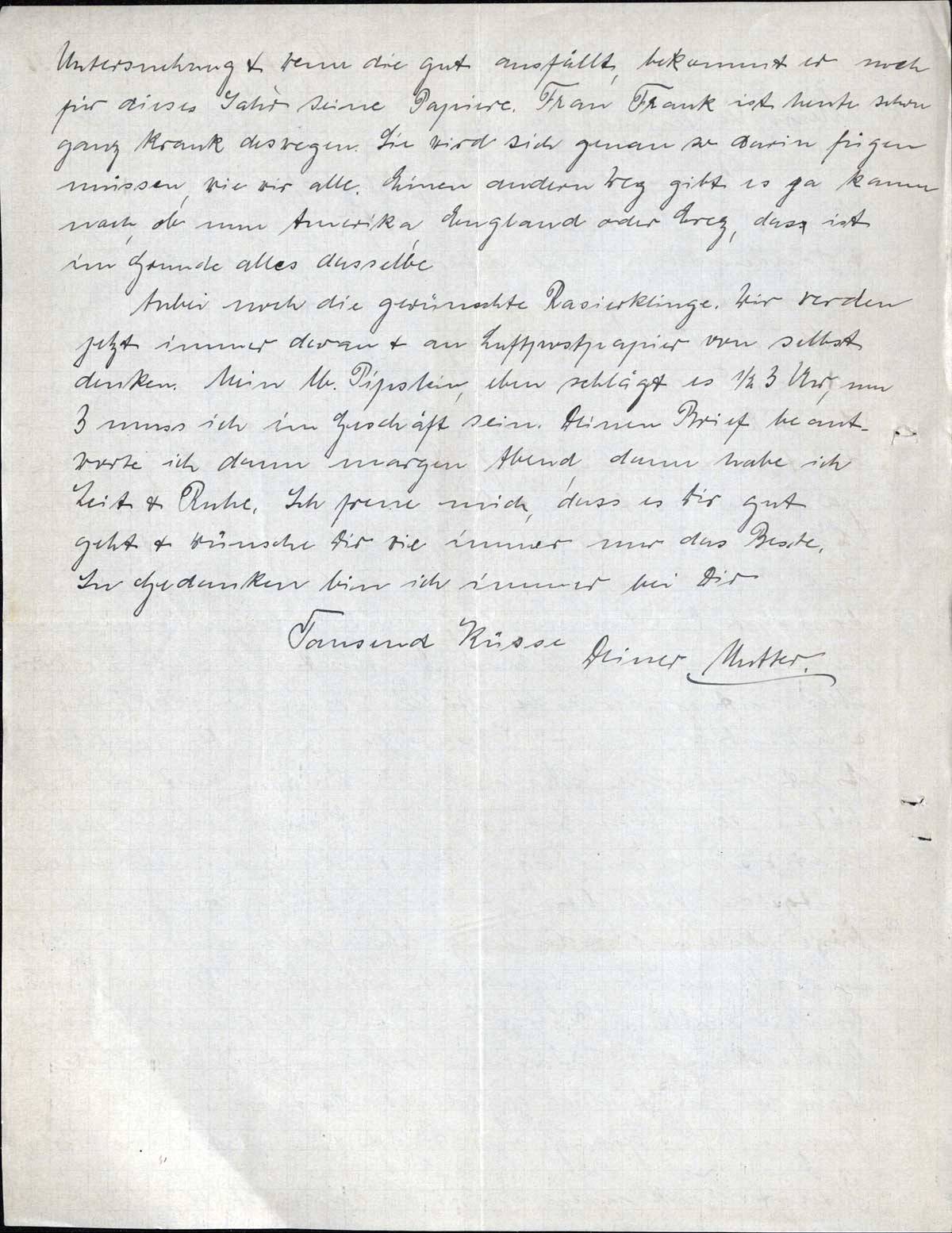 Anbei noch die gewünschte Rasierklinge. Wir werden jetzt immer daran & an Luftpostpapier von selbst denken. Mein lb. Pipslein, eben schlägt es ½ 3 Uhr, um 3 muss ich im Geschäft sein. Deinen Brief beantworte ich dann morgen Abend, dann habe ich Zeit & Ruhe. Ich freue mich, dass es Dir gut geht & wünsche Dir wie immer nur das Beste.