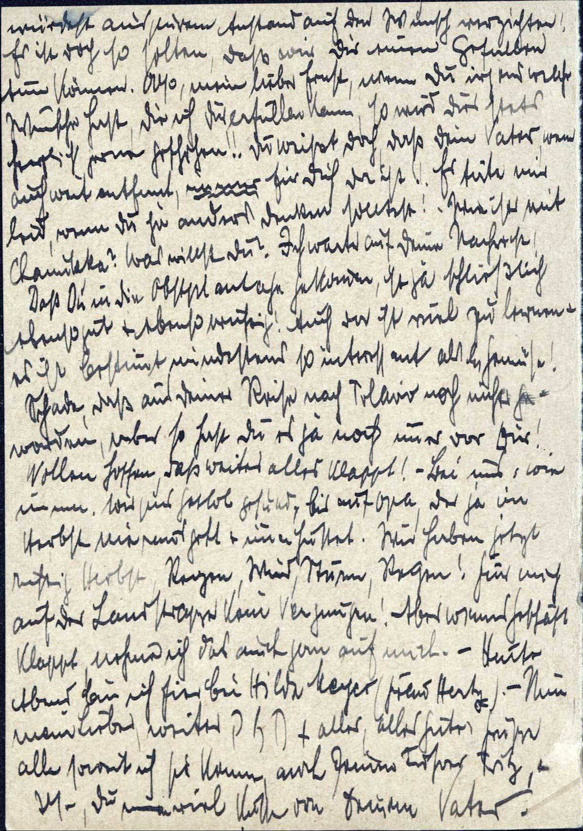 Schade, daß aus Deiner Reise nach Tel-Aviv noch nichts geworden, aber so hast Du es ja noch immer vor Dir! Wollen hoffen, daß weiter alles klappt! - Bei uns: wie immer. Wir sind gttlob gesund, bis auf Opa, der ja im Herbst nie rausgeht & immer hustet. Wir haben jetzt richtig Herbst, Regen, Wind, Sturm, Regen! Für mich auf der Landstraße kein Vergnügen! Aber wenns Geschäft klappt, nehme ich das auch gern auf mich. - Heute Abend bin ich hier bei Hilde Meyer (Frau Hertz). - Nun, mein Lieber, weiter [..] & alles, alles Gute. Grüße alle soweit ich sie kenne, auch Deinen Führer Fritz, & Ilse, Du nun viel Küsse von Deinem Vater.