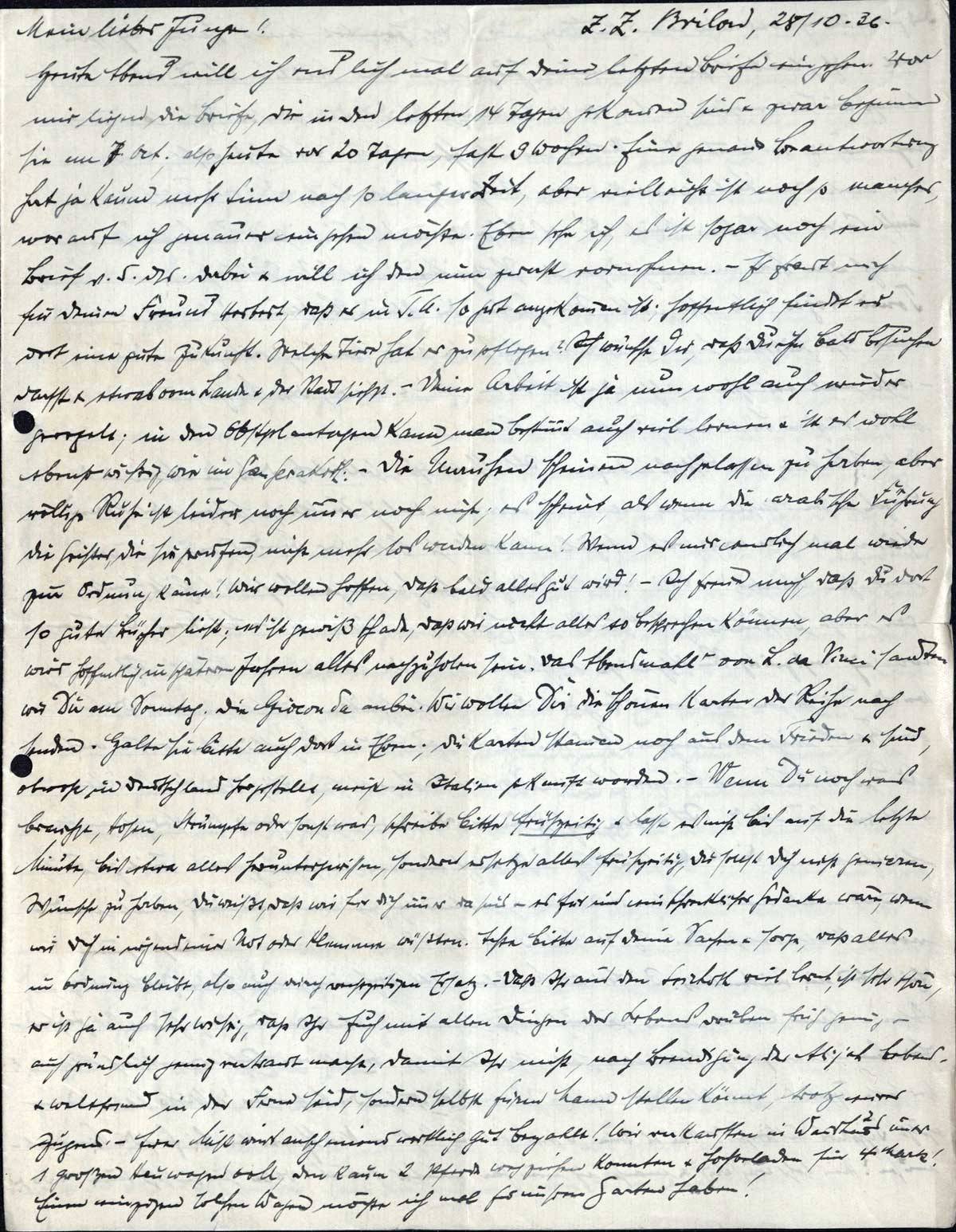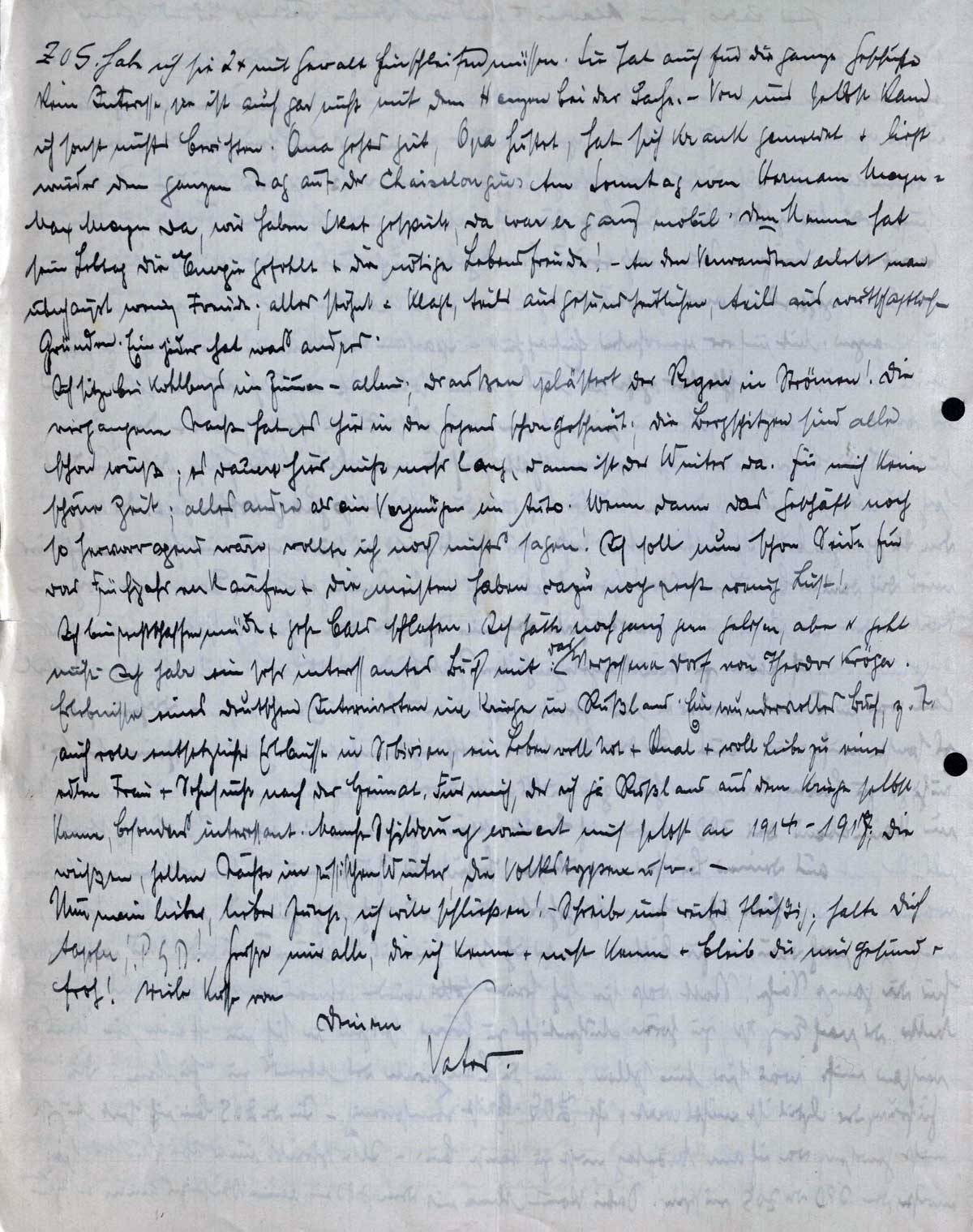 ZOG. habe ich sie 2 x mit Gewalt hinschleifen müssen. Sie hat auch für die ganze Geschichte kein Interesse, sie ist auch gar nicht mit dem Herzen bei der Sache. - Von uns selbst kann ich sonst nichts berichten. Oma gehts gut, Opa hustet, hat sich krank bemeldet & liegt wieder den ganzen Tag auf der Chaiselongue. Am Sonntag war Hermann Meyer & Max Meyer da, wir haben Skat gespielt, da war er ganz mobil. Dem Manne hat sein Lebtag die Energie gefehlt & die nötige Lebensfreude! - An den Verwandten erlebt man überhaupt wenig Freude; alles stöhnt & klagt, teils aus gesundheitlichen, teils aus wirtschaftlichen Gründen. Ein jeder hat was andres.