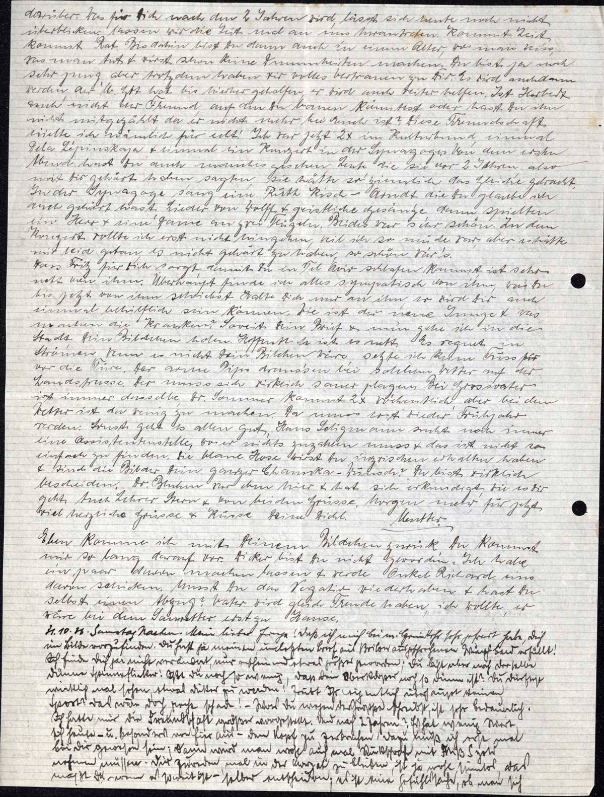 Von uns habe ich Dir sonst heute nichts mitzuteilen. Ich habe Dir ja alles Erdenkbare schon diese Woche geschrieben. Meine Erlebnisse seitdem sind ja nicht groß. Ich bin gestern Abend 8 h heimgekommen, heute früh, wie üblich, allerlei Besorgungen in der Stadt; vor mir liegt eine Menge schriftlicher Kram zu erledigen & ich bin so todmüde, daß ich gleich erst ½ Std. schlafen muß. Vielleicht bummele ich dann mal mit Mutter in die Stadt; ich möchte evtl. mal zu Spiro, mal sehen, wie weit die sind.