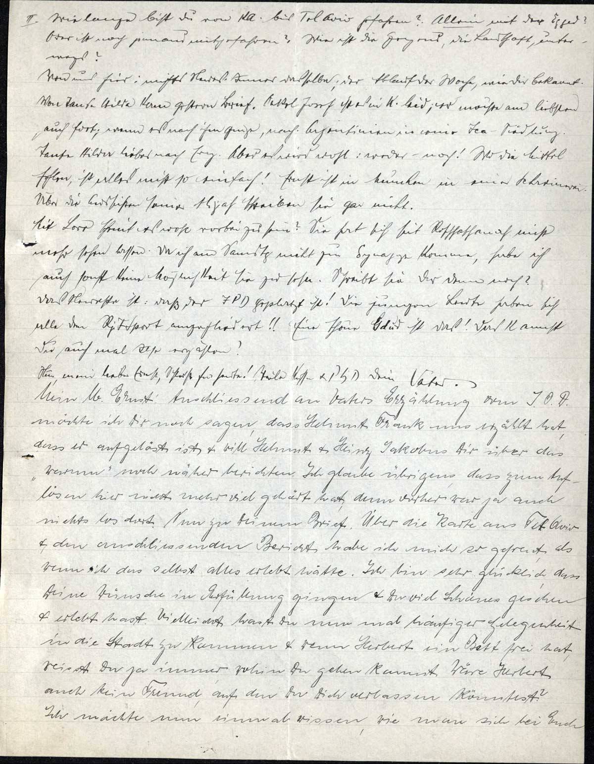 Mein lb. Ernst! Anschliessend an Vaters Erzählung vom J.P.D. möchte ich Dir noch sagen, dass Helmut Frank uns erzählt hat, dass er aufgelöst ist & will Helmut & Heinz Jakobus Dir über das „warum” noch näher berichten. Ich glaube übrigens, dass zum Auflösen hier nicht mehr viel gehört hat, denn vorher war ja auch nichts los dort. Nun zu Deinem Brief. Über die Karte aus Tel-Aviv & den anschliessenden Bericht habe ich mich so gefreut; als wenn ich das selbst alles erlebt hätte. Ich bin sehr glücklich, dass Deine Wünsche in Erfüllung gingen & Du viel Schönes gesehen & erlebt hast. Vielleicht hast Du nun mal häufiger Gelegenheit in die Stadt zu kommen & wenn Herbert ein Bett frei hat, weisst Du ja immer, wohin Du gehen kannst. Wäre Herbert auch kein Freund, auf den Du Dich verlassen könntest? Ich möchte nun einmal wissen, wie man sich bei Euch