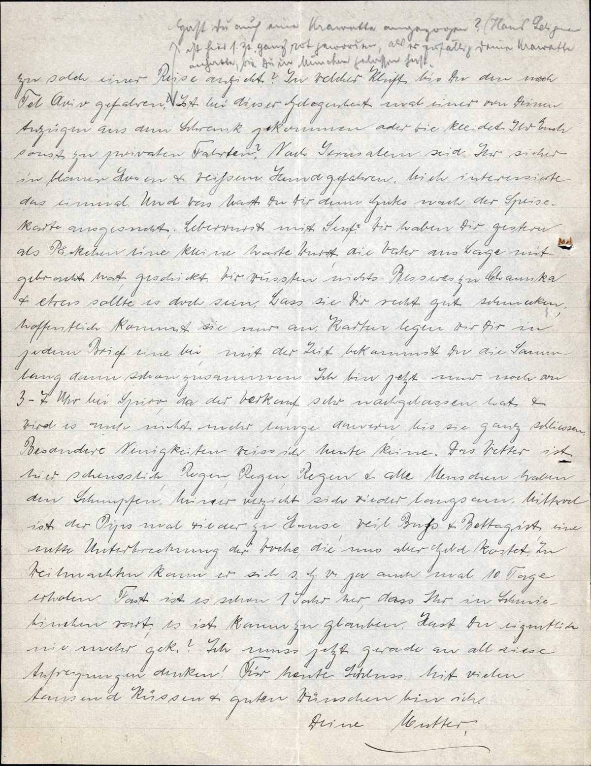 Daß nun endlich ziemlich Ruhe drüben eintritt, ist erfreulich. Und trotzdem sieht es meiner Ansicht nach nicht besonders günstig für uns aus. Von der Freundschaft der Araber halte ich nicht viel; es wird wohl noch eine Reihe von Friedensjahren bedürfen, bis die Masse der Araber so kultiviert ist, daß sie begreift, daß Frieden und Freundschaft mit den Juden ihr eigener Vorteil ist. Es könnte doch alles so schön sein, wenn der Aufbau des Landes mit gemeinschaftlichen Kräften & im gemeinschaftlichen Einverständnis vor sich ginge. Es fehlt vielleicht da noch manches auf beiden Seiten. Die Rolle der Mandaturmacht ist ja vielleicht auch nicht immer klar dabei, ob sie da immer richtig vermittelnd eingreift? Man kann von hier aus ja auch nicht ganz klar sehen.