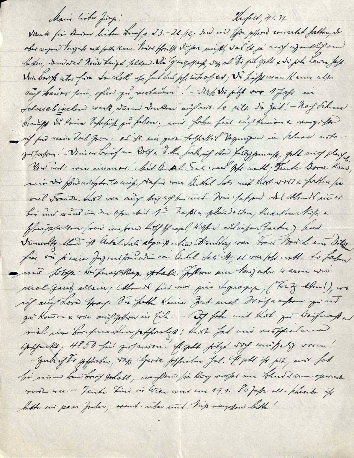 Dank für Deinen lieben Brief, v. 23.-26./12., den wir schon gestern erwartet hatten, der aber wegen Neujahr erst heute kam. Neues schreibst Du gar nichts, das ist ja auch eigentlich am besten, denn das Neue taugt selten. Die Hauptsache, daß es Dir gut geht & Du gute Laune hast. Dein Bericht über Eure Sichoth usw. hat uns sehr interessiert; Du siehst man kann also auch Bauer sein, ohne zu „verbauern”! - Daß Du jetzt vor 1 Jahr in Schniebinchen warst, daran denken auch wir. So eilt die Zeit! - Nach Schnee brauchst Du keine Sehnsucht zu haben; wir haben hier auch keinen & verzichte ich für mein Teil gern; es ist ein zweifelhaftes Vergnügen im Schnee autozufahren! - Deinen Brief an Rolf & Erke hab ich eben fertiggemacht, geht auch gleich ab.