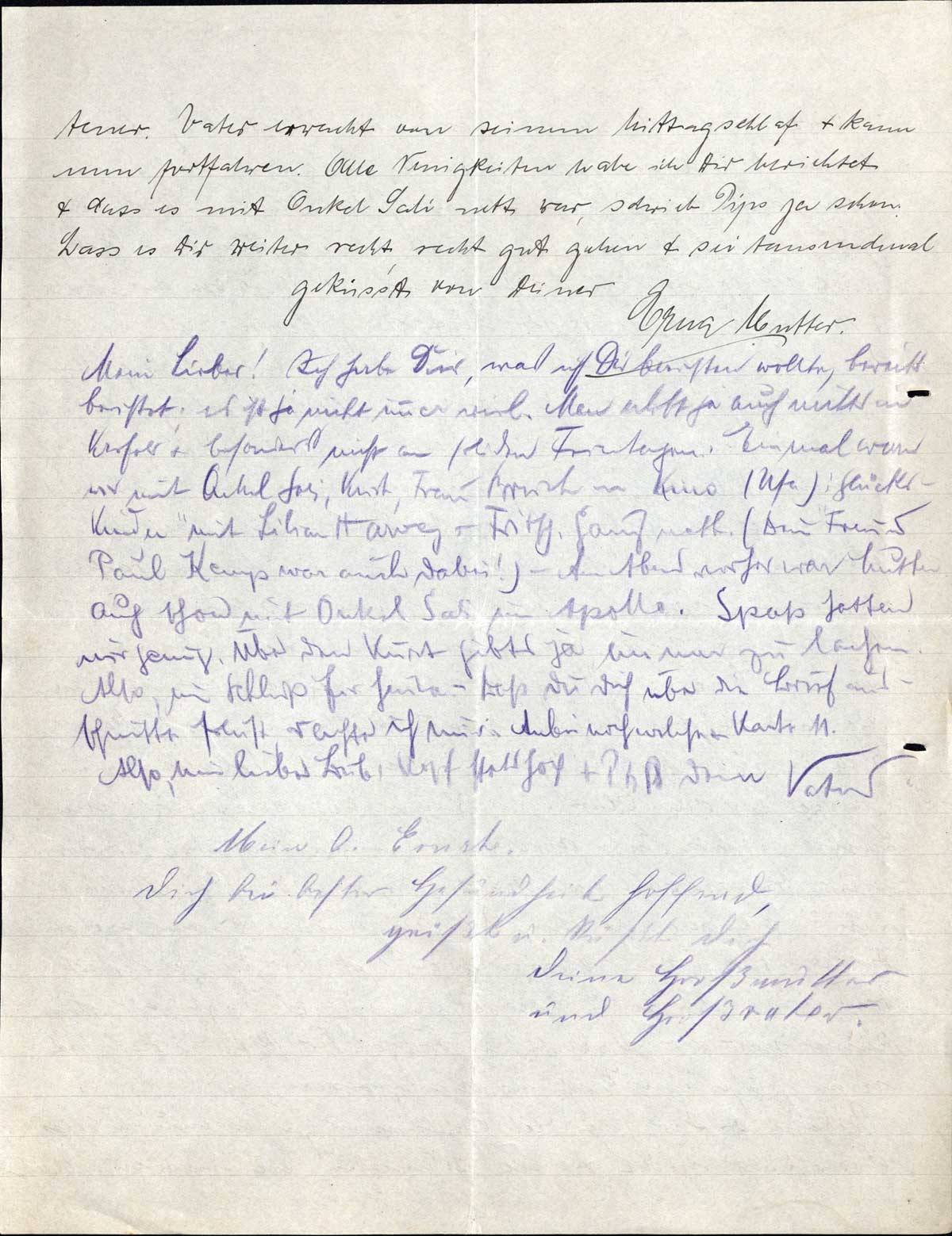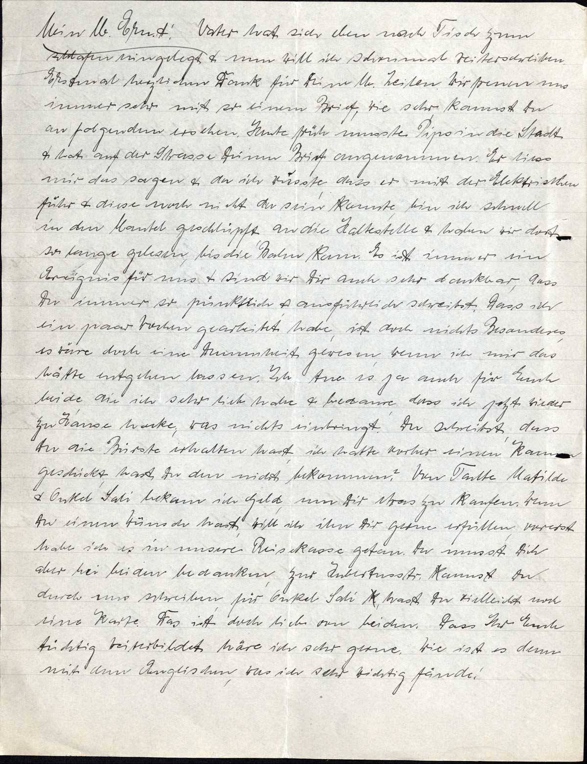 Mein lb. Ernst! Vater hat sich eben nach Tisch zum schlafen hingelegt & nun will ich schon mal weiterschreiben. Erstmal herzlichen Dank für Deine lb. Zeilen. Wir freuen uns immer sehr mit so einem Brief, wie sehr, kannst Du an folgendem ersehen. Heute früh musste Pips in die Stadt & hat auf der Strasse Deinen Brief angenommen. Er liess mir das sagen & da ich wusste, dass er mit der Elektrischen fuhr & diese noch nicht da sein konnte, bin ich schnell in den Mantel geschlüpft, an die Haltestelle & haben wir dort so lange gelesen, bis die Bahn kam. Es ist immer ein Ereignis für uns & sind wir Dir auch sehr dankbar, dass Du immer so pünktlich & ausführlich schreibst. Dass ich ein paar Wochen gearbeitet habe, ist doch nichts Besonderes, es wäre doch eine Dummheit gewesen, wenn ich mir das hätte entgehen lassen. Ich tue es ja auch für Euch beide, die ich sehr lieb habe & bedaure, dass ich jetzt wieder zu Hause hocke, was nichts einbringt. Du schreibst, dass Du die Bürste erhalten hast, ich hatte vorher einen Kamm geschickt, hast Du den nicht bekommen? Von Tante Matilde & Onkel Sali bekam ich Geld, um Dir etwas zu kaufen. Wenn Du einen Wunsch hast, will ich ihn Dir gerne erfüllen, vorerst habe ich es in unsere Reisekasse getan. Du musst Dich aber bei beiden bedanken, zur Hubertusstr. kannst Du durch uns schreiben, für Onkel Sali hast Du vielleicht noch eine Karte. Das ist doch lieb von beiden. Dass Ihr Euch tüchtig weiterbildet höre ich sehr gerne. Wie ist es denn mit dem Englischen, was ich sehr wichtig fände!