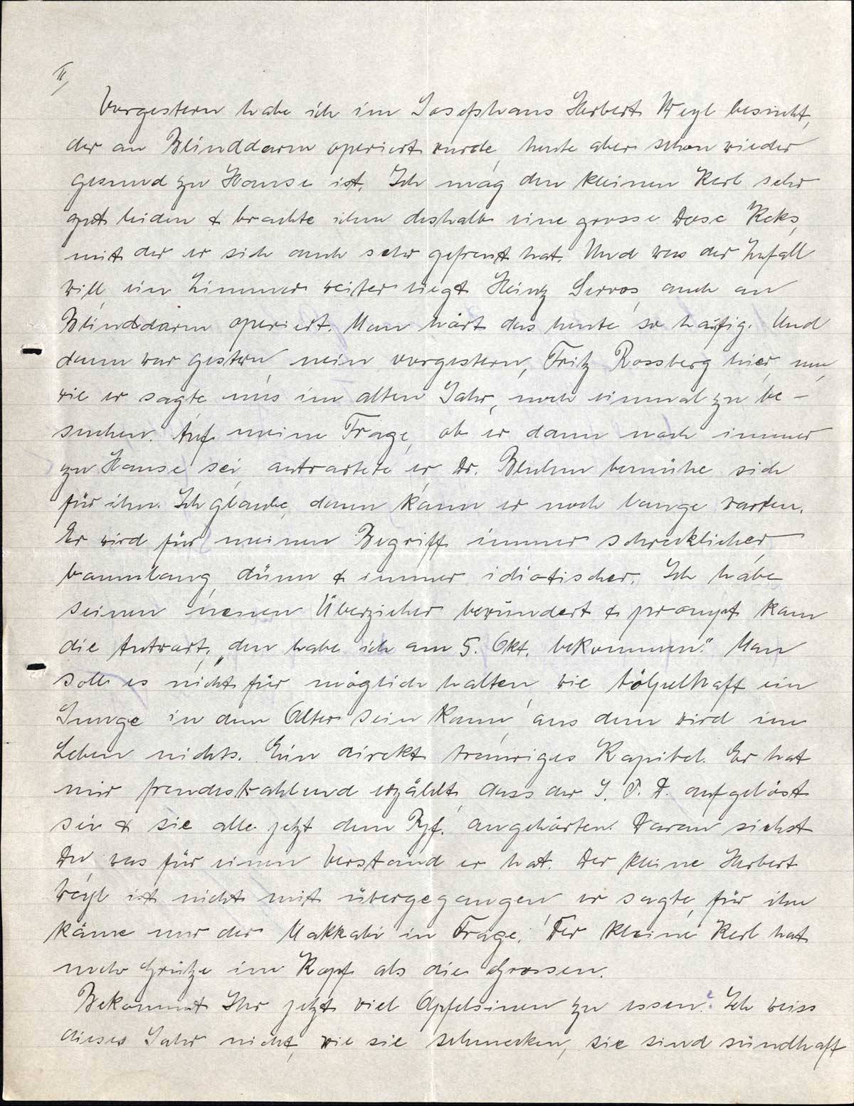 Vorgesern habe ich im Josefshaus Herbert Weyl besucht, der an Blinddarm operiert wurde, heute aber schon wieder gesund zu Hause ist. Ich mag den kleinen Kerl sehr gut leiden & brachte ihm deshalb eine grosse Dose Keks, mit der er sich auch sehr gefreut hat. Und was der Zufall will, ein Zimmer weiter liegt Heinz Serros, auch an Blinddarm operiert. Man hört das heute so häufig. Und dann war gestern, nein vorgestern, Fritz Rossberg hier, um, wie er sagte, uns im alten Jahr, noch einmal zu besuchen. Auf meine Frage, ob er dann noch immer zu Hause sei, antwortete er, Dr. Bluhm bemühte sich für ihn. Ich glaube, dann kann er noch lange warten. Er wird für meinen Begriff immer schrecklicher, baumlang, dünn & immer idiotischer. Ich habe seinen neuen Überzieher bewundert & prompt kam die Antwort, „den habe ich am 5. Okt. bekommen”. Man soll es nicht für möglich halten, wie tölpelhaft ein Junge in dem Alter sein kann, aus dem wird im Leben nichts. Ein direkt trauriges Kapitel. Er hat mir freudestrahlend erzählt, dass der J.V.D. aufgelöst sei & sie alle jetzt dem RjF. angehörten. Daran siehst Du, was für einen Verstand er hat. Der kleine Herbert Weyl ist nicht mit übergegangen, er sagte, für ihn käme nur der Makkabi in Frage. Der kleine Kerl hat mehr Grütze im Kopf als die Grossen.