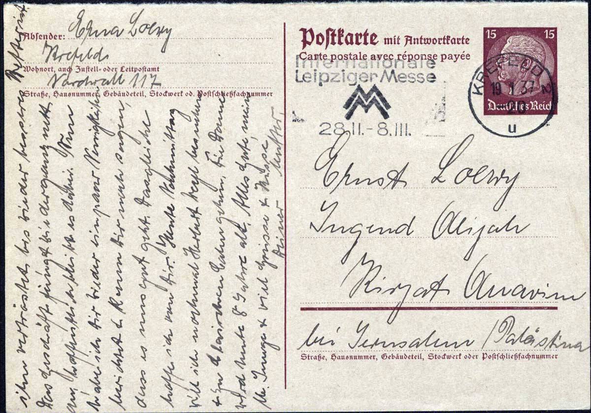 Gerade kommt von Ernst Lamm eine Karte, was aber drauf steht, kann ich Dir nicht erzählen, inteligenter Weise schreibt er bis auf einen Satz alles Iwrith. Er bleibt 2 Jahr dort, mehr weiss ich nicht, obwohl wir wiederholt nach allem angefragt haben. Am Sonntag waren die Eltern von Max Levy hier & haben wir uns gegenseitig unsere Briefe vorgelesen. Max ist wieder in Tel Aviv bei der alten Adresse, bei Gelegenheit kannst Du ihn mal aufsuchen. Dann waren wir Samstag bei der Trauung von Paul Levy, die der Lehrer Tannenberg abgehalten hat & sehr schön war. Mit Dr. Bl. ist Paul ja nicht gut freund & hat ihn deshalb nicht genommen. Eigentlich hatte ich Vater versprochen, diese Woche mit auf Tour zu fahren. Nachdem ich aber gestern mit nach Kaldenkirchen war & wie ein Eisklumpen nach Hause kam, habe ich gekniffen & den Pips alleine fahren lassen. Es war ihm nicht ganz recht, aber ich habe