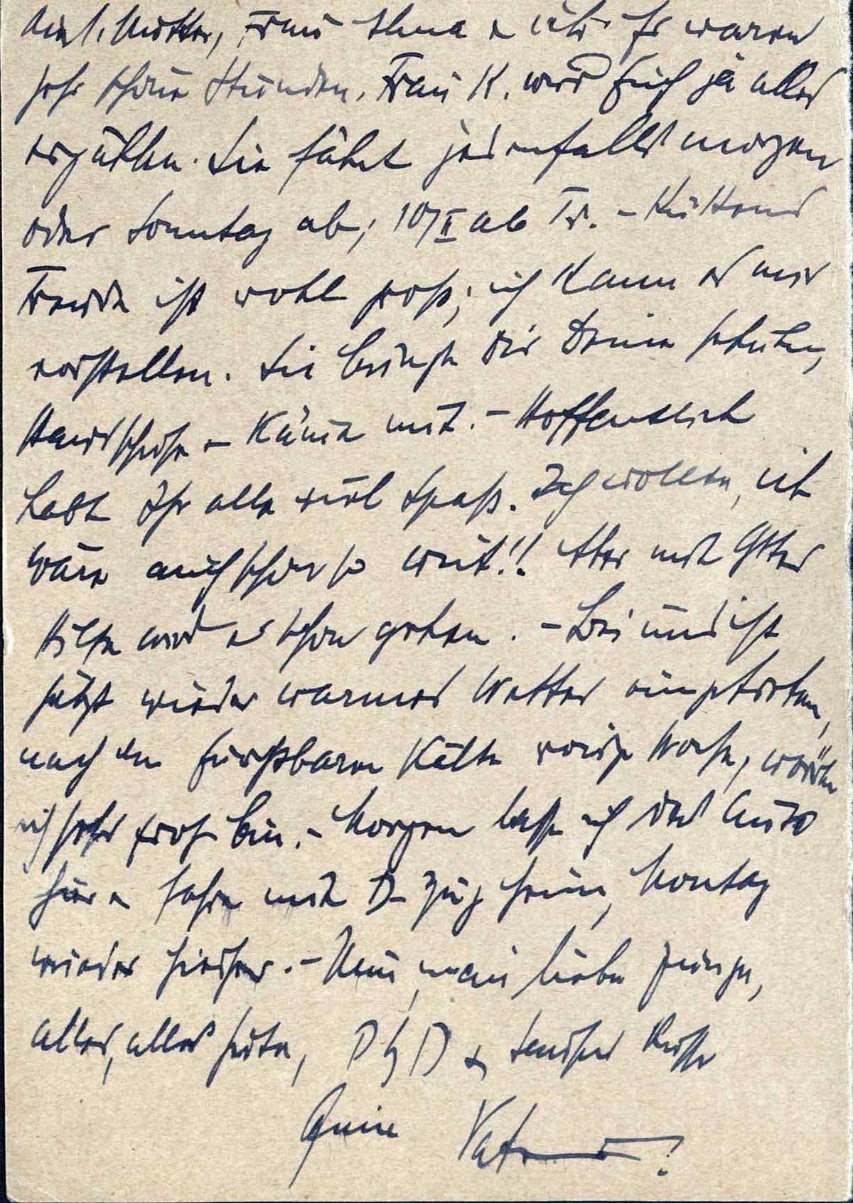 Mein lieber Junge! Ich bin heute hier & sollst Du einen Gruß haben. Geschäftl. geht es einigermaßen, mir persönlich sehr gut. Ich hoffe, daß auch Du recht wohl bist. Wenn ich morgen Abend heimkomme, freue ich mich auf Deine Post. Am Sonntag waren wir bei Kükens Eltern, wo wir von ¼ 4 h Nachm.-9 h Abends waren.