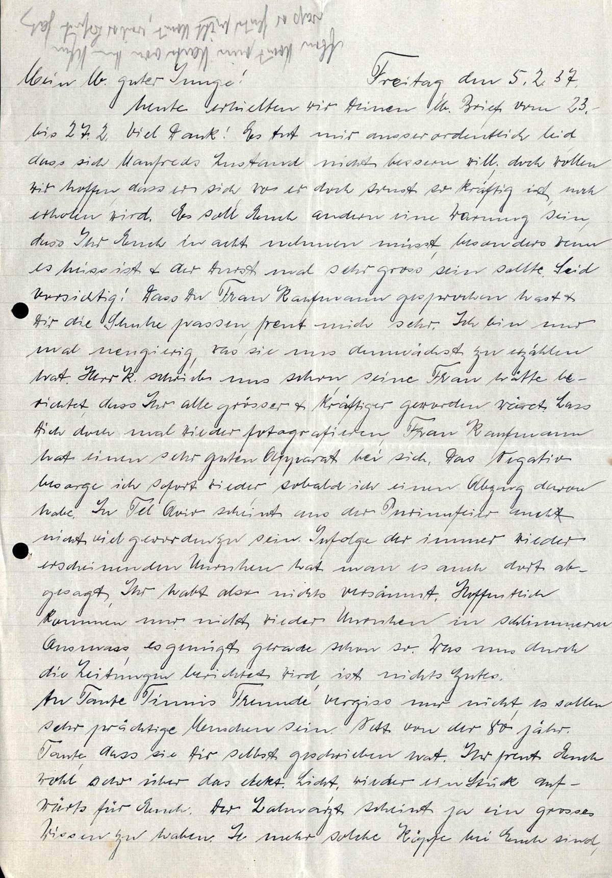 heute erhielten wir Deinen lb. Brief vom 23. bis 27.2. Viel Dank! Es tut mir ausserordentlich leid, dass sich Manfreds Zustand nicht bessern will; doch wollen wir hoffen, dass er sich, wo er doch sonst so kräftig ist, noch erholen wird. Es soll Euch andern eine Warnung sein, dass Ihr Euch in acht nehmen müsst, besonders wenn es heiss ist & der Durst mal sehr gross sein sollte. Seid vorsichtig! Dass Du Frau Kaufmann gesprochen hast & Dir die Schuhe passen, freut mich sehr. Ich bin nur mal neugierig, was sie uns demnächst zu erzählen hat. Herr K. schrieb uns schon, seine Frau hätte berichtet, dass Ihr alle grösser & kräftiger geworden wäret. Lass Dich doch mal wieder fotografieren, Frau Kaufmann hat einen sehr guten Apparat bei sich. Das Negativ besorge ich sofort wieder, sobald ich einen Abzug davon habe. In Tel Aviv scheint aus der Purimfeier auch nicht viel geworden zu sein. Infolge der immer wieder erscheinenden Unruhen hat man es auch dort abgesagt. Ihr habt also nichts versäumt. Hoffentlich kommen nur nicht wieder Unruhen in schlimmerem Ausmass, es genügt gerade schon so. Was uns durch die Zeitungen berichtet wird, ist nichts Gutes.