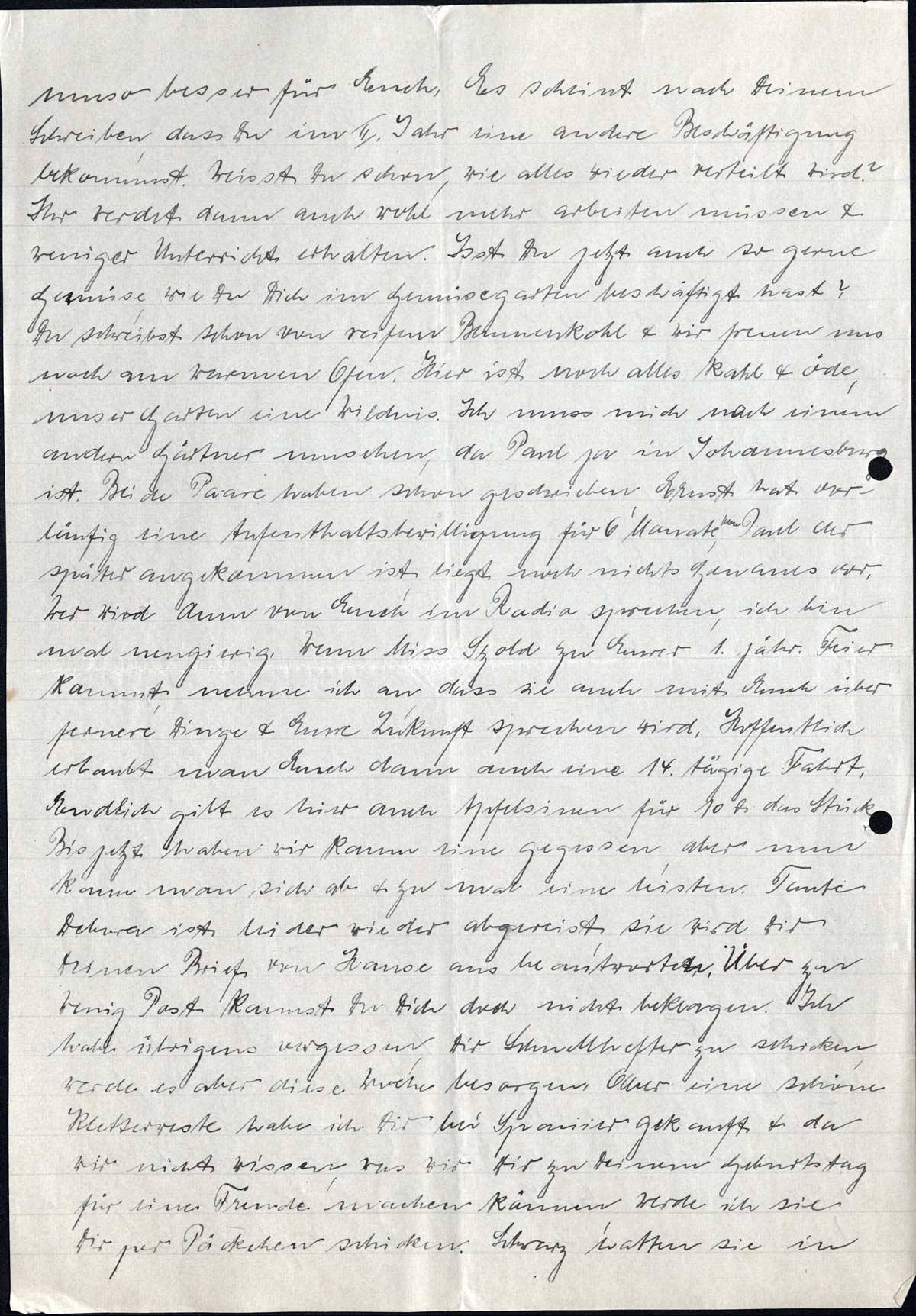 umso besser für Euch. Es scheint nach Deinem Schreiben, dass Du im II. Jahr eine andere Beschäftigung bekommst. Weisst Du schon, wie alles wieder verteilt wird? Ihr werdet dann auch wohl mehr arbeiten müssen & weniger Unterricht erhalten. Isst Du jetzt auch so gerne Gemüse, wie Du Dich im Gemüsegarten beschäftigt hast? Du schreibst schon von reifem Blumenkohl & wir freuen uns noch am warmen Ofen. Hier ist noch alles kahl & öde, unser Garten eine Wildnis. Ich muss mich nach einem andern Gärtner umsehen, da Paul ja in Johannesburg ist. Beide Paare haben schon geschrieben, Ernst hat vorläufig eine Aufenthaltsbewilligung für 6 Monate, von Paul der später angekommen ist, liegt noch nichts Genaues vor. Wer wird denn von Euch im Radio sprechen, ich bin mal neugierig. Wenn Miss Szold zu Eurer 1. jähr. Feier kommt, nehme ich an, dass sie auch mit Euch über fernere Dinge & Eure Zukunft sprechen wird. Hoffentlich erlaubt man Euch dann auch eine 14 tägige Fahrt. Endlich gibt es hier auch Apfelsinen für 10 Pf. das Stück. Bis jetzt haben wir kaum eine gegessen, aber nun kann man sich ab & zu mal eine leisten. Tante Debora ist leider wieder abgereist, sie wird Dir Deinen Brief von Hause aus beantworten. Über zu wenig Post kannst Du Dich doch nicht beklagen. Ich habe übrigens vergessen, Dir Schnellhefter zu schicken, werde es aber diese Woche besorgen. Aber eine schöne Kletterweste habe ich Dir bei Spanier gekauft & da wir nicht wissen, was wir Dir zu Deinem Geburtstag für eine Freude machen können, werde ich sie Dir per Päckchen schicken. Schwarz hatten sie in