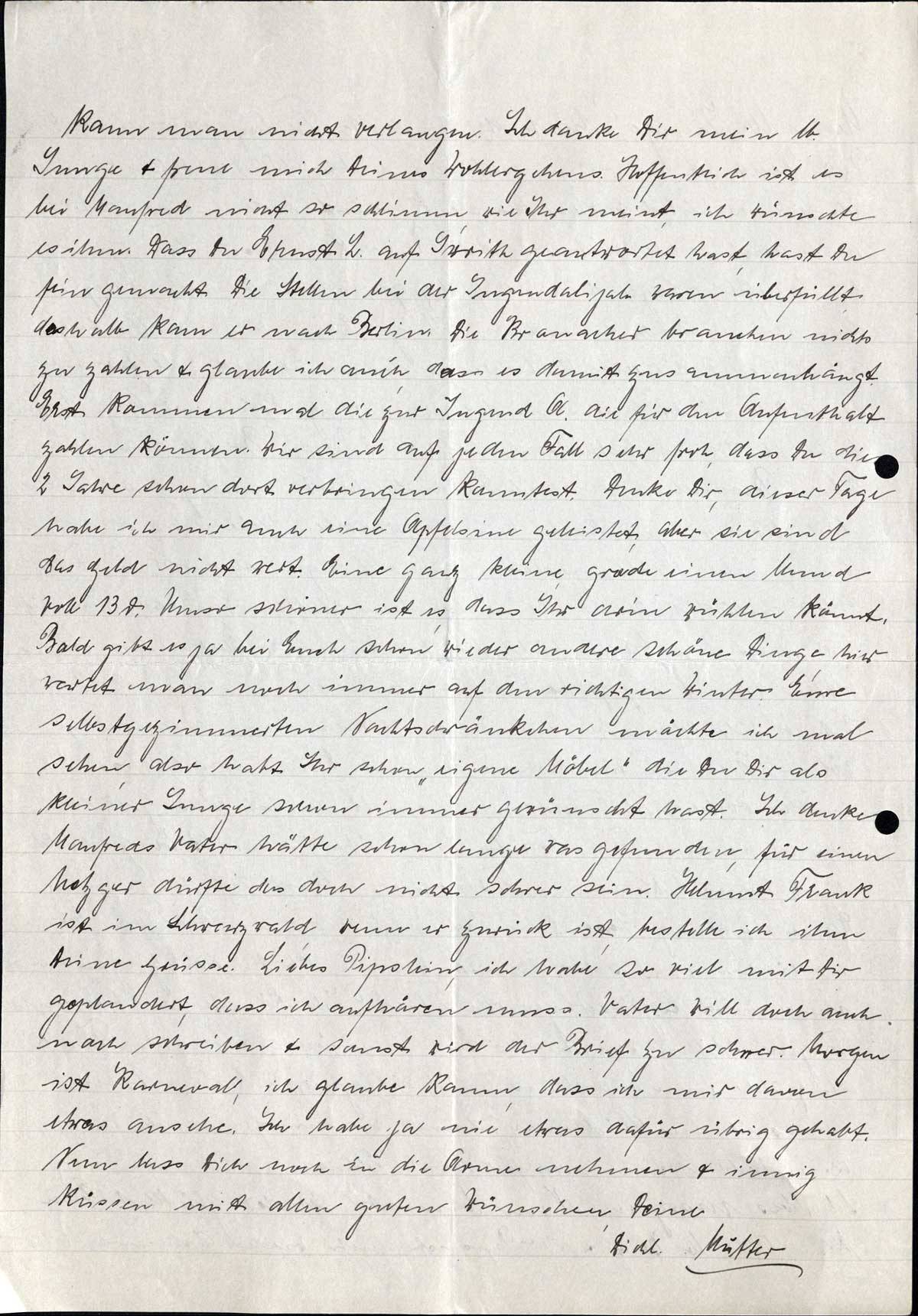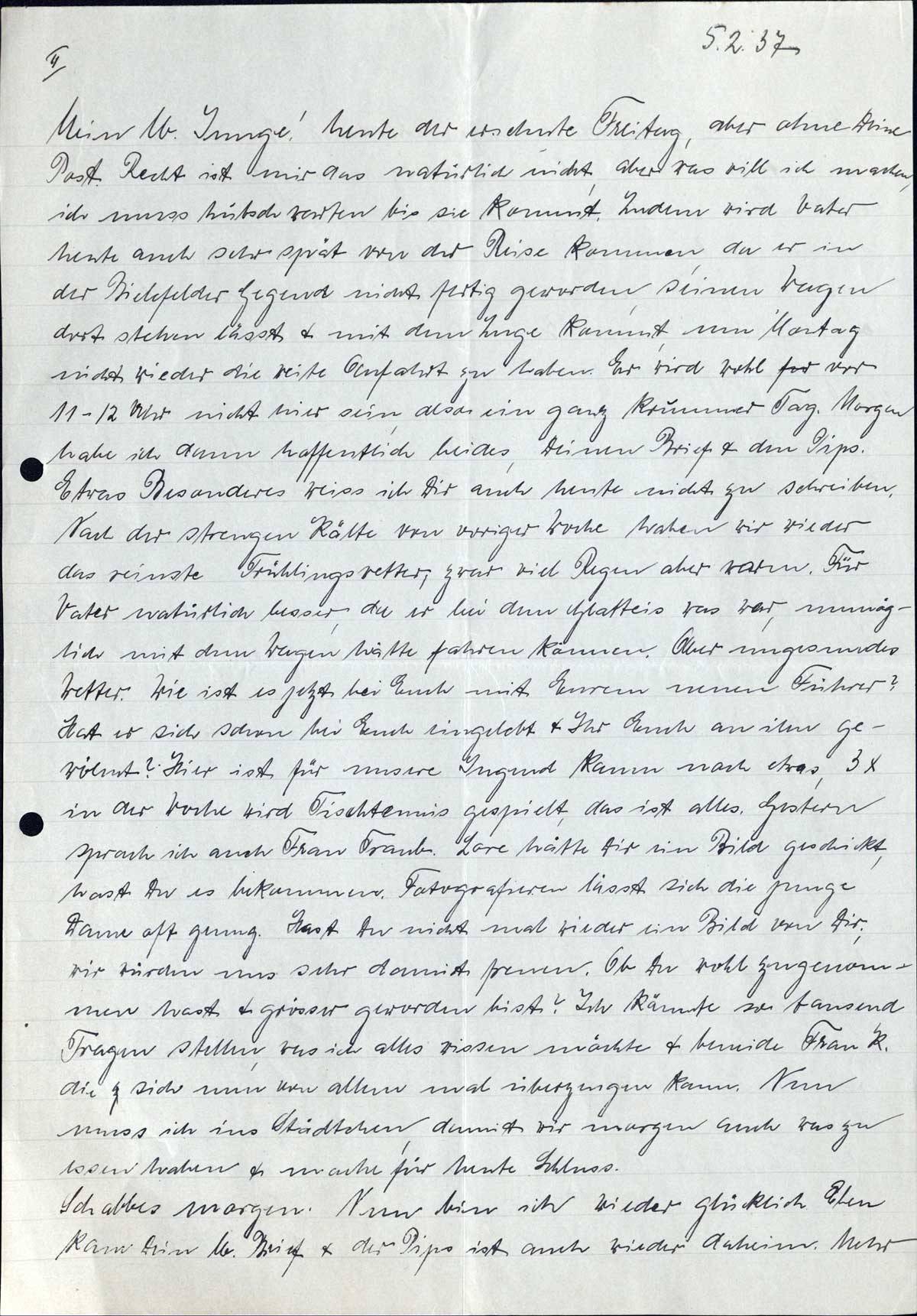 Mein lb. Junge! heute der ersehnte Freitag, aber ohne Deine Post. Recht ist mir das natürlich nicht, aber was will ich machen, ich muss hübsch warten bis sie kommt. Zudem wird Vater heute auch sehr spät von der Reise kommen, da er in der Bielefelder Gegend nicht fertig geworden, seinen Wagen dort stehen lässt & mit dem Zuge kommt, um Montag nicht wieder die weite Anfahrt zu haben. Er wird wohl vor 11-12 Uhr nicht hier sein, also ein ganz krummer Tag. Morgen habe ich dann hoffentlich beides, Deinen Brief & den Pips. Etwas Besonderes weiss ich Dir auch heute nicht zu schreiben. Nach der strengen Kälte von voriger Woche haben wir wieder das reinste Frühlingswetter, zwar viel Regen aber warm. Für Vater natürlich besser, da er bei dem Glatteis was war, unmöglich mit dem Wagen hätte fahren können. Aber ungesundes Wetter. Wie ist es jetzt bei Euch mit Eurem neuen Führer? Hat er sich schon bei Euch eingelebt & Ihr Euch an ihn gewöhnt? Hier ist für unsere Jugend kaum noch was, 3 x in der Woche wird Tischtennis gespielt, das ist alles. Gestern sprach ich auch Frau Traub. Lore hätte Dir ein Bild geschickt, hast Du es bekommen. Fotografieren lässt sich die junge Dame oft genug. Hast Du nicht mal wieder ein Bild von Dir; wir würden uns sehr damit freuen. Ob Du wohl zugenommen hast & grösser geworden bist? Ich könnte so tausend Fragen stellen, was ich alles wissen möchte & beneide Frau K. die sich nun von allem mal überzeugen kann. Nun muss ich ins Städtchen, damit wir morgen auch was zu essen haben & mache für heute Schluss.