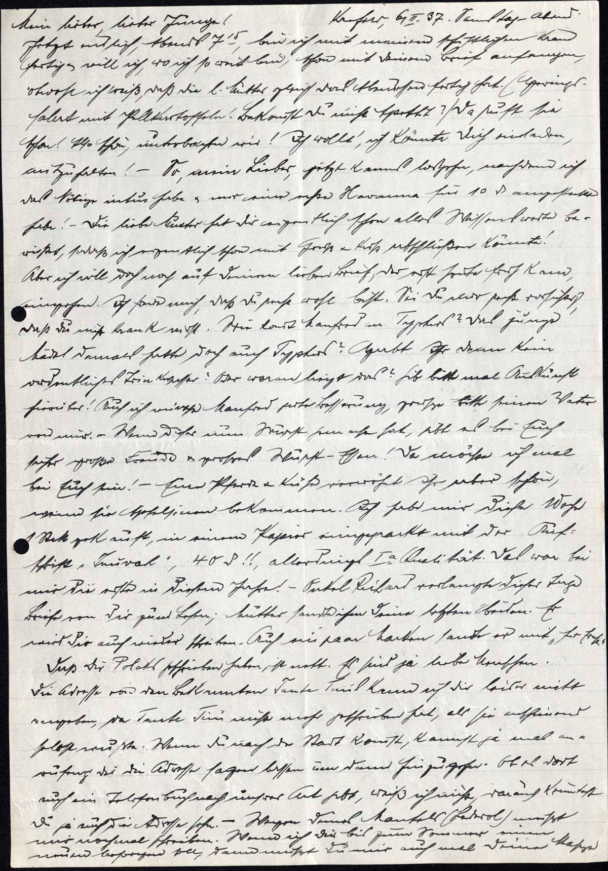 Jetzt endlich, Abends 7.15, bin ich mit meinem schriftlichen Kram fertig & will ich, wo ich so weit bin, schon mit Deinem Brief anfangen, obwohl ich weiß, daß die l. Mutter gleich das Abendessen fertig hat. (Heringssalat mit Pellkartoffeln! Bekommst Du nicht Appetit?) Da ruft sie schon! Also schön, unterbrechen wir! Ich wollt', ich könnte Dich einladen, mitzuhalten! - So, mein Lieber, jetzt kanns losgehen, nachdem ich das Nötige intus habe & mir eine echte Havanna für 10 Pf. angesteckt habe! - Die liebe Mutter hat Dir eigentlich schon alles Wissenswerte berichtet, sodaß ich eigentlich schon mit Gruß & Kuß abschließen könnte! Aber ich will doch noch auf Deinen lieben Brief, der erst heute früh kam, eingehen. Ich freue mich, daß Du recht wohl bist. Sei Du nur recht vorsichtig, daß Du nicht krank wirst. Wie kommt Manfred an Typhus? Das junge Mädel damals hatte doch auch Typhus? Habt Ihr denn kein ordentliches Trinkwasser? Oder woran liegt das? Gib bitte mal Auskunft hierüber! Auch ich wünsche Manfred gute Besserung, grüße bitte seinen Vater von mir. - Wenn dieser nun Wurst gemacht hat, gibt es bei Euch sicher große Freude & großes Wurst-Essen! Da möchte ich mal bei Euch sein! - Eure Pferde & Kühe verwöhnt Ihr aber schön, wenn sie Apfelsinen bekommen. Ich habe mir diese Woche 1 Stck gekauft, in einem Papier eingepackt mit der Aufschrift „Tnuvah”, 40 Pf!!, allerdings I a Qualität. Das war bei mir die erste in diesem Jahre! - Onkel Richard verlangte dieser Tage Briefe von Dir zum Lesen; Mutter sandte ihm Deine letzten beiden. Er wird Dir auch wieder schreiben. Auch ein paar Marken sandte er mit „für Ernst”.