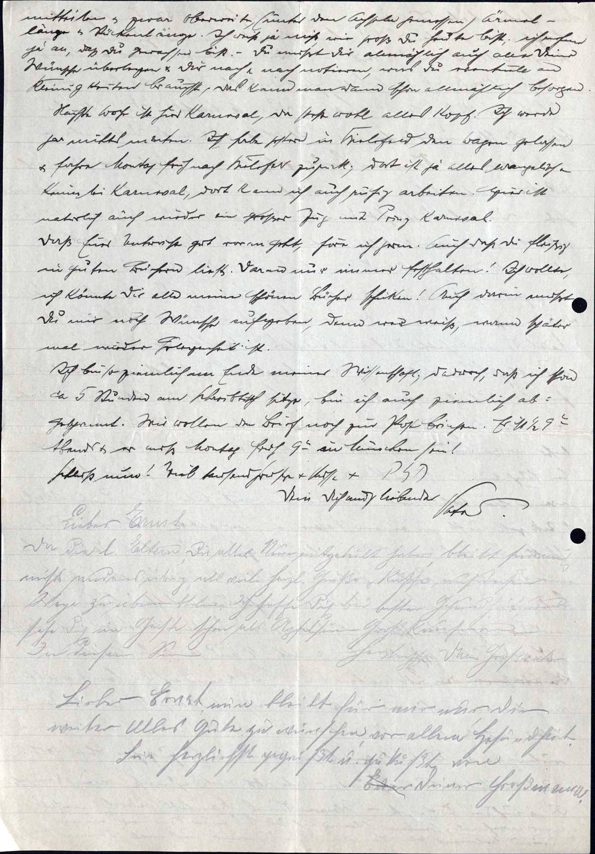 Ich bin so ziemlich am Ende meiner Wissenschaft; dadurch, daß ich schon ca 5 Stunden am Schreibtisch sitze, bin ich auch ziemlich abgespannt. Wir wollen den Brief noch zur Post bringen. Es ist ½ 9 h Abends & er muß Montag früh 9 h in München sein!