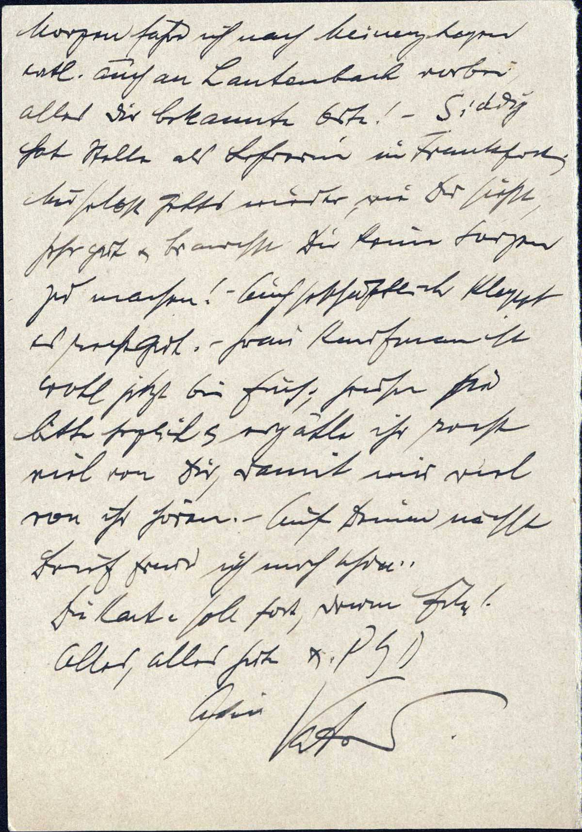 Morgen fahre ich nach Meinerzhagen evtl. auch an Lautenbach vorbei, alles Dir bekannte Orte! - Siddy hat Stelle als Lehrerin in Frankfurt. Mir selbst gehts wieder, wie Du siehst, sehr gut & brauchst Dir keine Sorgen zu machen! - Auch geschäftlich klappt es recht gut. - Frau Kaufmann ist wohl jetzt bei Euch; grüße sie bitte herzlich & erzähle ihr recht viel von Dir, damit wir viel von ihr hören. - Auf Deinen nächsten Brief freue ich mich schon.