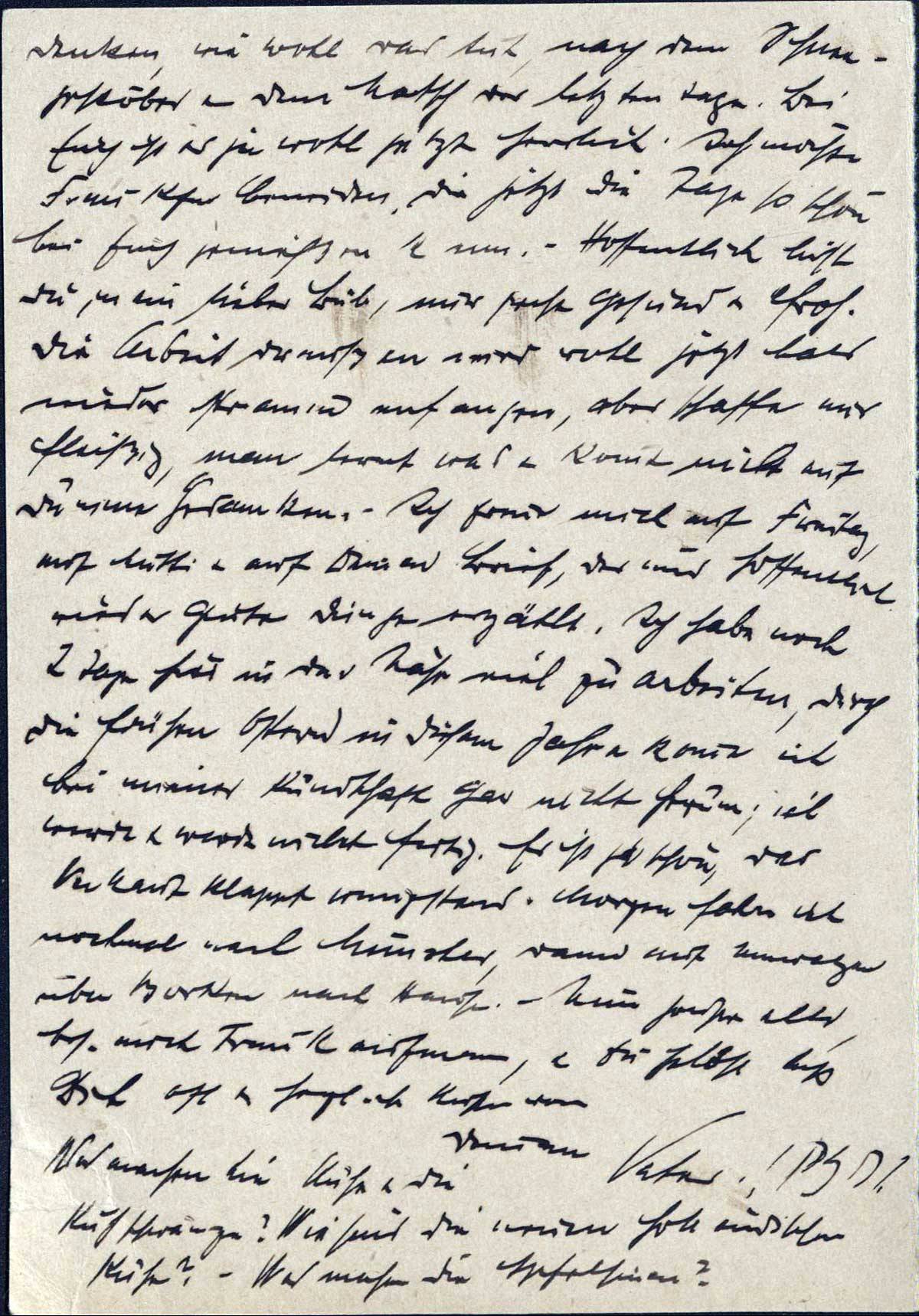 Borghorst, Mittwoch, 24/II.37. Mein lieber Junge! Ich bin mal wieder hier in B. (wo ich mir den Knöchelbruch geholt habe) & denke an Dich. Gestern sandte ich Dir wieder 10.- Mk. - Besondres habe ich Dir eigentlich nicht mitzuteilen; es geht mir gut, auch von der l. Mutter hatte ich heute eine Karte, daß sie gesund ist. Geschäftlich geht es auch sehr gut, sodaß ich zufrieden sein kann. Das Wetter war dieser Tage schrecklich, nur kam heute endlich mal die Sonne heraus, es war ein richtiger Frühlingstag; Du kannst Dir kaum mehr
