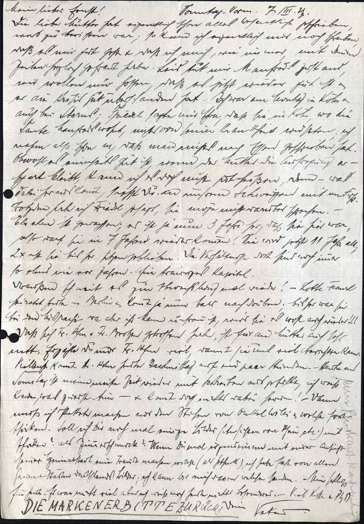 Mein lieber Junge! Den Anfang habe ich gemacht & will ich natürlich auch noch fortfahren. Zunächst einmal herzlichen Dank für Deinen lb. Brief, mit dem wir uns wieder sehr gefreut haben. Mein Katzenjammer ist längst überwunden, das kommt, wie Du schreibst, in den besten Familien mal vor. Augenblicklich ist Vater ja zu Hause, dann habe ich dazu ja auch weniger Grund. Was sagst Du dazu, dass Vater schon