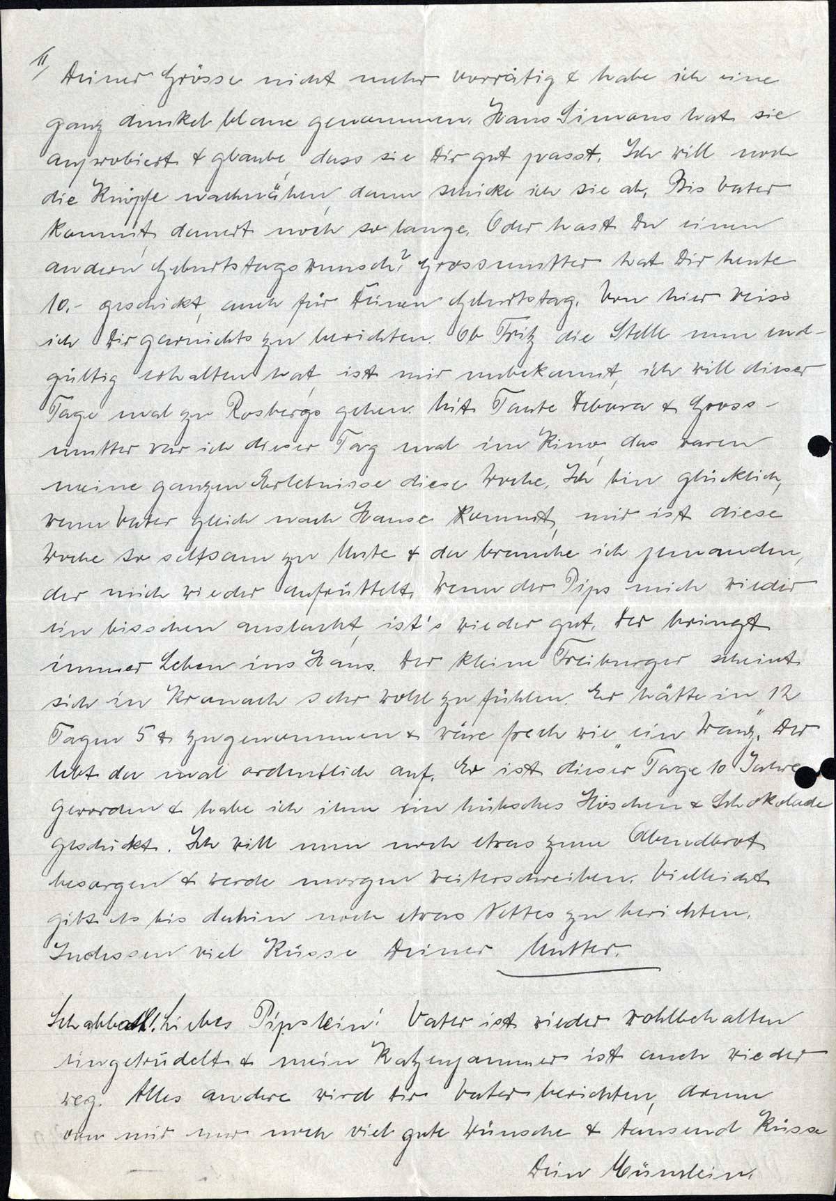 Deiner Grösse nicht mehr vorrätig & habe ich eine ganz dunkelblaue genommen. Hans Simons hat sie anprobiert & glaube, dass sie Dir gut passt. Ich will noch die Knöpfe nachnähen, dann schicke ich sie ab. Bis Vater kommt, dauert noch so lange. Oder hast Du einen andern Geburtstagswunsch? Grossmutter hat Dir heute 10.- geschickt, auch für Deinen Geburtstag. Von hier weiss ich Dir garnichts zu berichten. Ob Fritz die Stelle nun endgültig erhalten hat, ist mir unbekannt, ich will dieser Tage mal zu Rosbergs gehen. Mit Tante Debora & Grossmutter war ich dieser Tage mal im Kino, das waren meine ganzen Erlebnisse diese Woche. Ich bin glücklich, wenn Vater gleich nach Hause kommt, mir ist diese Woche so seltsam zu Mute & da brauche ich jemanden, der mich wieder aufrüttelt. Wenn der Pips mich wieder ein bisschen auslacht, ist's wieder gut. Der bringt immer Leben ins Haus. Der kleine Freiburger scheint sich in Kronach sehr wohl zu fühlen. Er hätte in 12 Tagen 5 Pfd. zugenommen & wäre frech wie „ein Wanz”. Der lebt da mal ordentlich auf. Er ist dieser Tage 10 Jahre geworden & habe ich ihm ein hübsches Höschen & Schokolade geschickt. Ich will nun noch etwas zum Abendbrot besorgen & werde morgen weiterschreiben. Vielleicht gibt es bis dahin noch etwas Nettes zu berichten.
