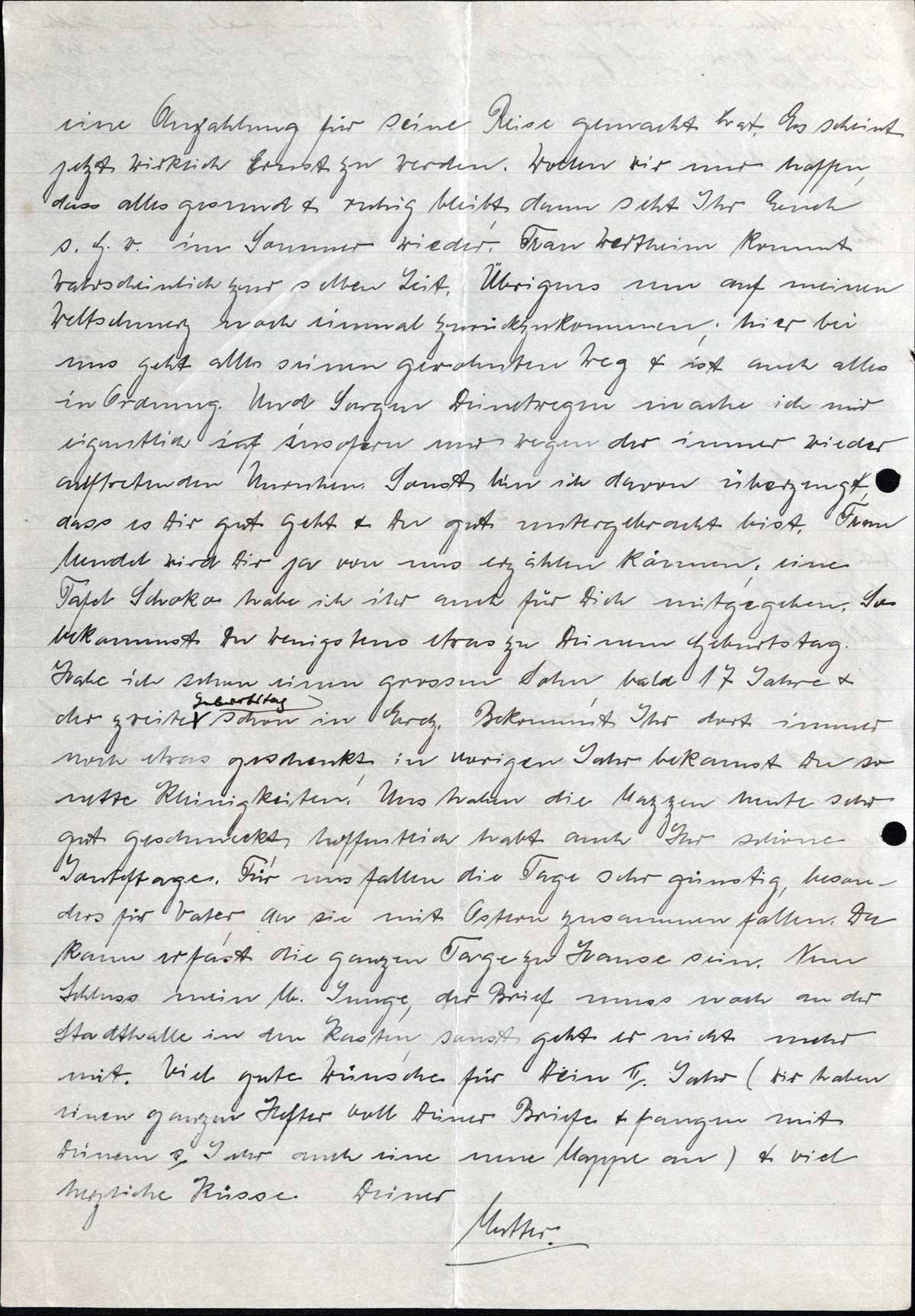 eine Anzahlung für seine Reise gemacht hat. Es scheint jetzt wirklich Ernst zu werden. Wollen wir nur hoffen, dass alles gesund & ruhig bleibt, dann seht Ihr Euch s. G. w. im Sommer wieder. Frau Wertheim kommt wahrscheinlich zur selben Zeit. Übrigens um auf meinen Weltschmerz noch einmal zurückzukommen; hier bei uns geht alles seinen gewohnten Weg & ist auch alles in Ordnung. Und Sorgen Deinetwegen mache ich mir eigentlich insofern nur wegen der immer wieder auftretenden Unruhen. Sonst bin ich davon überzeugt, dass es Dir gut geht & Du gut untergebracht bist. Frau Mendel wird Dir ja von uns erzählen können; eine Tafel Schoko habe ich ihr auch für Dich mitgegeben. So bekommst Du wenigstens etwas zu Deinem Geburtstag. Habe ich schon einen grossen Sohn, bald 17 Jahre & der zweite Geburtstag schon in Erez. Bekommt Ihr dort immer noch etwas geschenkt, im vorigen Jahr bekamst Du so nette Kleinigkeiten. Uns haben die Mazzen heute sehr gut geschmeckt, hoffentlich habt auch Ihr schöne Jonteftage. Für uns fallen die Tage sehr günstig, besonders für Vater, da sie mit Ostern zusammen fallen. Da kann er fast die ganzen Tage zu Hause sein. Nun Schluss mein lb. Junge, der Brief muss noch an der Stadthalle in den Kasten, sonst geht er nicht mehr mit. Viel gute Wünsche für Dein II. Jahr (wir haben einen ganzen Hefter voll Deiner Briefe & fangen mit Deinem 2. Jahr auch eine neue Mappe an) & viel herzliche Küsse Deiner
