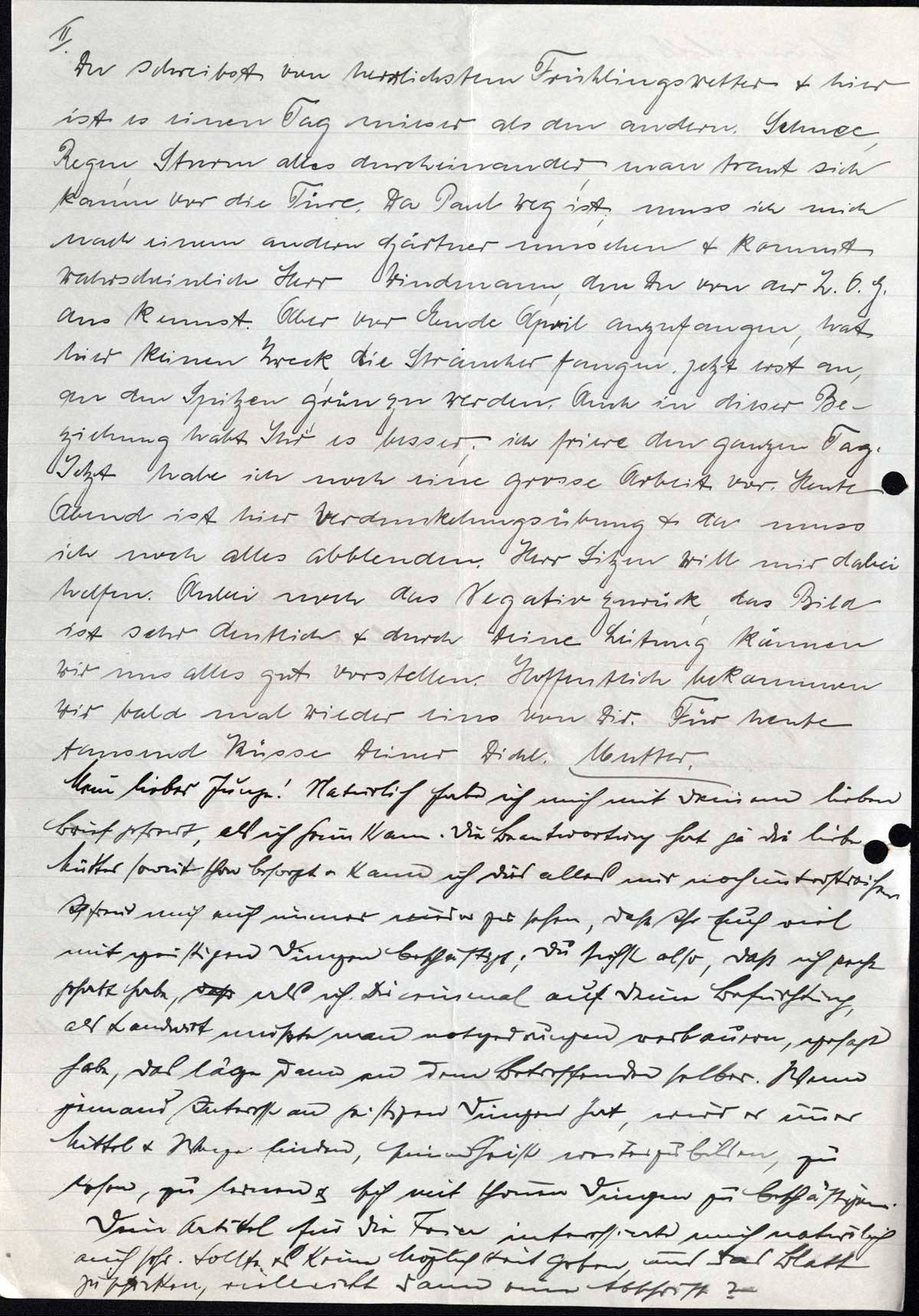 Du schreibst von herrlichstem Frühlingswetter & hier ist es einen Tag mieser als den andern. Schnee, Regen, Sturm alles durcheinander, man traut sich kaum vor die Türe. Da Paul weg ist, muss ich mich nach einem andern Gärtner umsehen & kommt wahrscheinlich Herr Windmann, den Du von der Z.O.G. aus kennst. Aber vor Ende April anzufangen, hat hier keinen Zweck, die Sträucher fangen jetzt erst an, an den Spitzen grün zu werden. Auch in dieser Beziehung habt Ihr es besser; ich friere den ganzen Tag. Jetzt habe ich noch eine grosse Arbeit vor. Heute Abend ist hier Verdunkelungsübung & da muss ich noch alles abblenden. Herr Litzen will mir dabei helfen. Anbei noch das Negativ zurück, das Bild ist sehr deutlich & durch Deine Leitung können wir uns alles gut vorstellen. Hoffentlich bekommen wir bald mal wieder eins von Dir. Für heute tausend Küsse Deiner Dichl. Mutter.