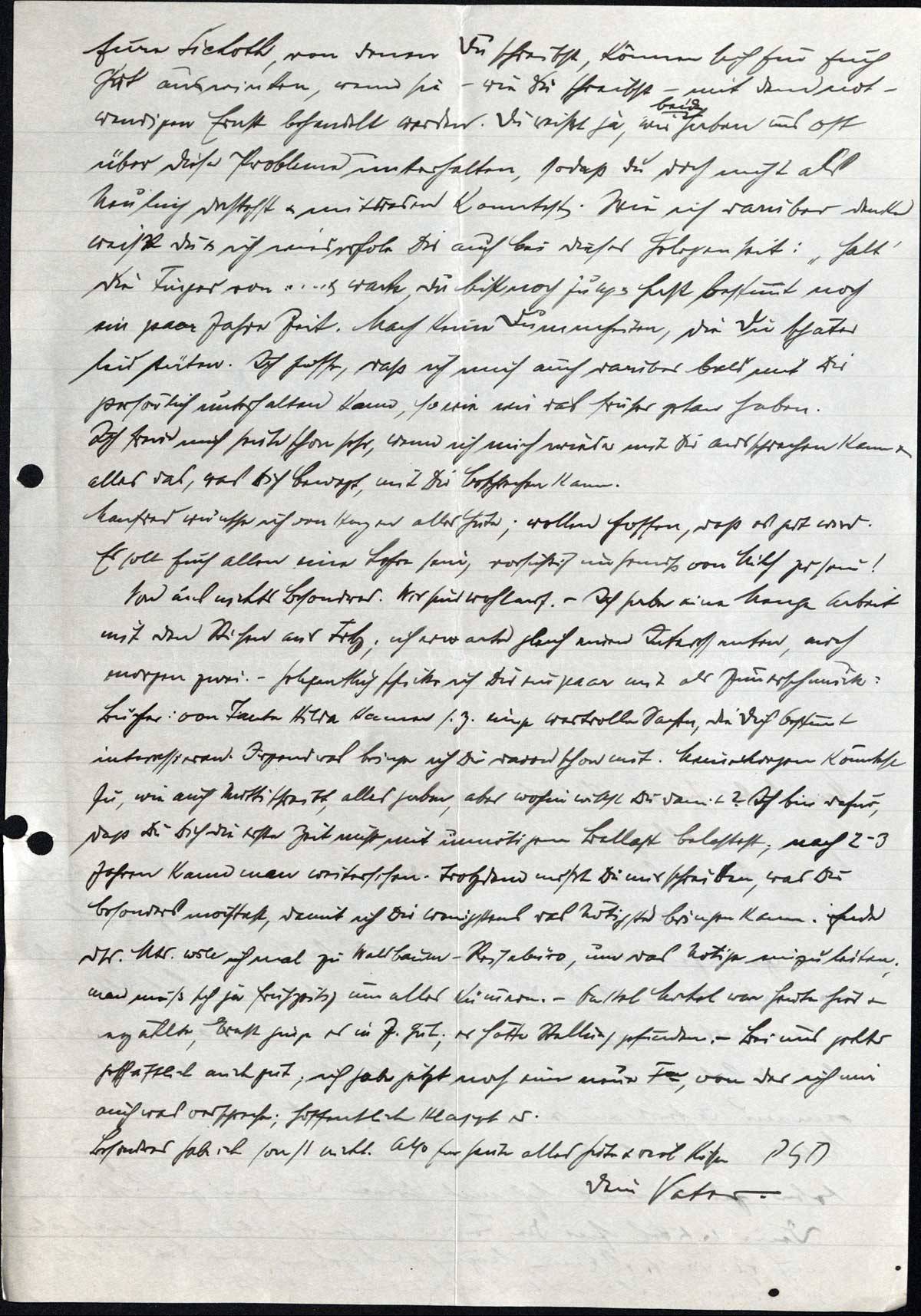 Eure Sichoth, von denen Du schreibst, können sich für Euch gut auswirken, wenn Sie - wie Du schreibst - mit dem notwendigen Ernst behandelt werden. Du weißt ja, wir beide haben uns oft über diese Probleme unterhalten, sodaß Du doch nicht als Neuling dastehst & mitreden kannst. Wie ich darüber denke weißt Du & ich wiederhole Dir auch bei dieser Gelegenheit: „Halt' die Finger von ..... & warte, Du bist noch jung & hast bestimmt noch ein paar Jahre Zeit. Mach keine Dummheiten, die Dir später leid täten. Ich hoffe, daß ich mich auch darüber bald mit Dir persönlich unterhalten kann, so wie wir das früher getan haben. Ich freue mich heute schon sehr, wenn ich mich wieder mit Dir aussprechen kann & alles das, was Dich bewegt, mit Dir besprechen kann.