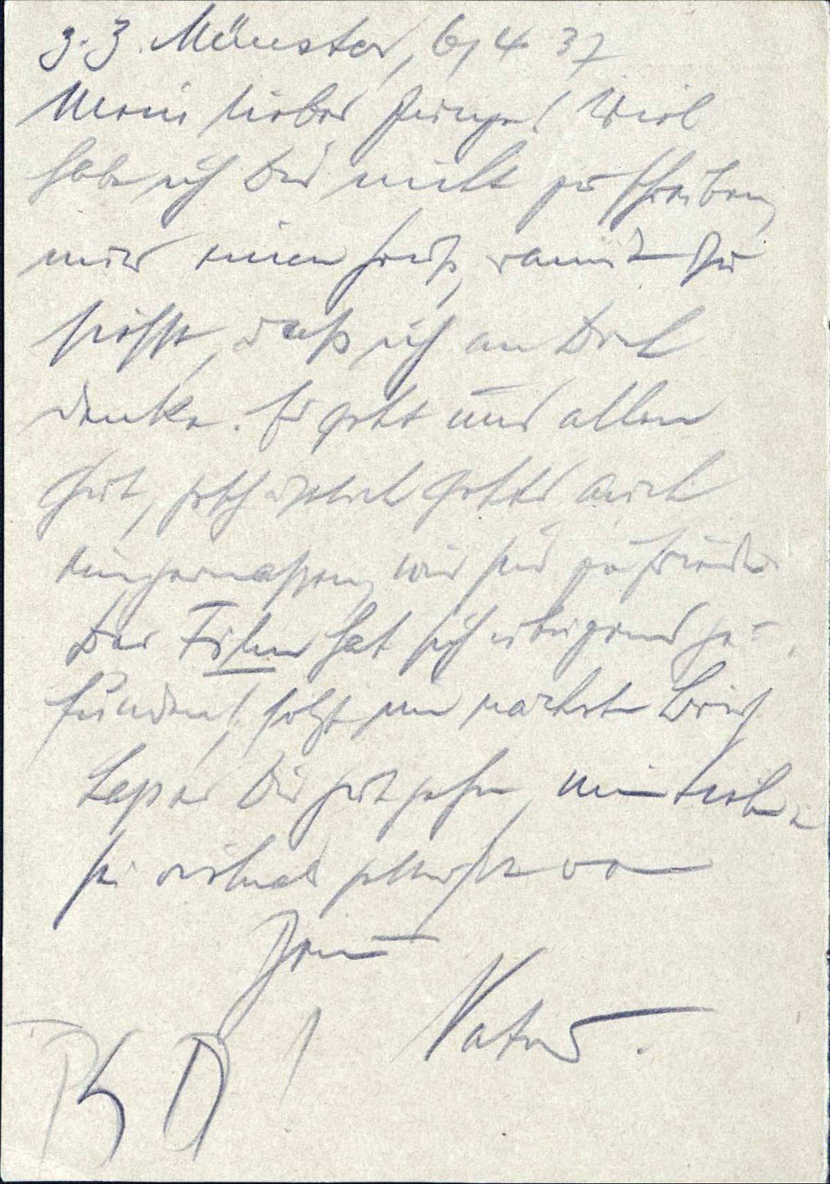 Mein lieber Junge! Viel habe ich Dir nicht zu schreiben, nur einen Gruß, damit Du siehst, daß ich an Dich denke. Es geht uns allen gut, geschäftlich gehts auch einigermaßen, wir sind zufrieden.