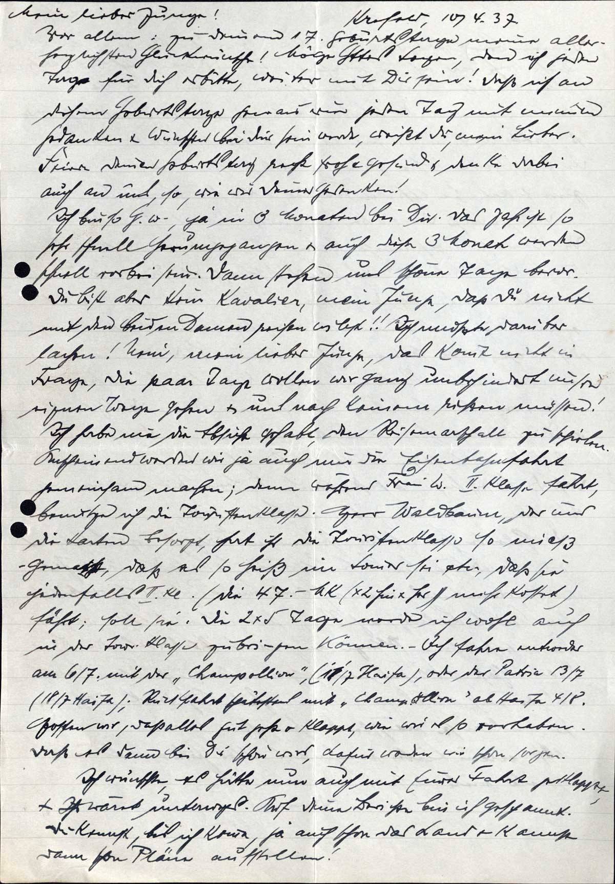 Ich bin so G. w., ja in 3 Monaten bei Dir. Das Jahr ist so sehr schnell herumgegangen & auch diese 3 Monate werden schnell vorbei sein. Dann stehen uns schöne Tage bevor. Du bist aber kein Kavalier, mein Junge, daß Du nicht mit den beiden Damen reisen willst!! Ich mußte darüber lachen! Nein, mein lieber Junge, das kommt nicht in Frage, die paar Tage wollen wir ganz unbehindert unsre eigenen Wege gehen & uns nach keinem richten müssen! Ich habe nie die Absicht gehabt, den Reisemarschall zu spielen. Anscheinend werden wir ja auch nur die Eisenbahnfahrt gemeinsam machen; denn während Frau W. II. Klasse fährt, benutze ich die Touristenklasse. Herr Waldbaum, der uns die Karten besorgt, hat ihr die Touristenklasse so mieß gemacht, daß es so heiß im Sommer sei etc, daß sie jedenfalls II. Kl. (die 47.- Mk (x 2 hin & her) mehr kostet) fährt; soll sie. Die 2 x 5 Tage werde ich wohl auch in der Tour.Klasse zubringen können. - Ich fahre entweder am 6/7. mit der „Champollion”, /11/7 Haifa), oder der Patria 13/7 (18/7 Haifa); Rückfahrt spätestens mit „Champollion” ab Haifa 4/8. Hoffen wir, daß alles gut geht & klappt, wie wir es so vorhaben. Daß es dann bei Dir schön wird, dafür werden wir schon sorgen.