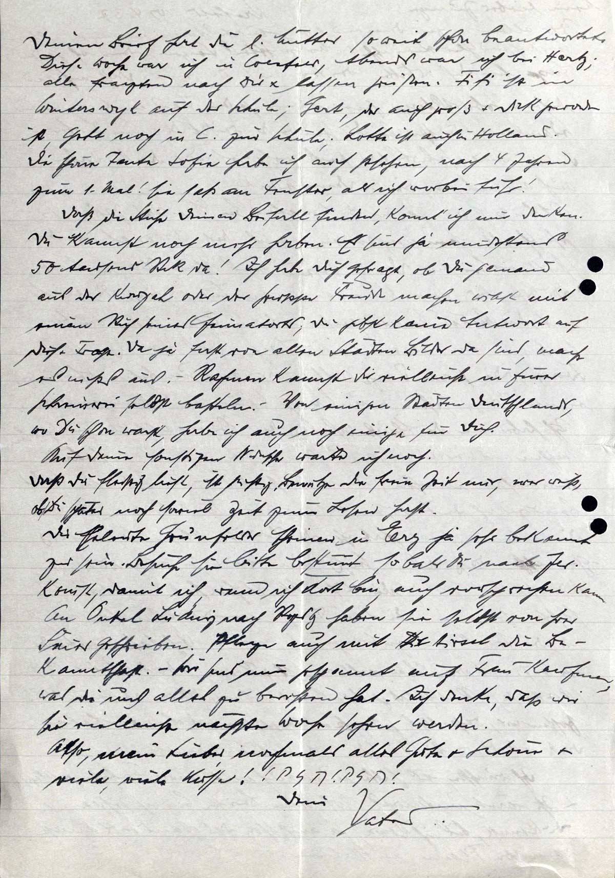 Deinen Brief hat die l. Mutter so weit schon beantwortet. Diese Woche war ich in Coesfeld, Abends war ich bei Hertz; alle fragten nach Dir & lassen grüßen. Fifi ist in Winterswijk auf der Schule; Gert, der auch groß & dick geworden ist, geht noch in C. zur Schule; Lotte ist auch in Holland. Die schöne Tante Sofie habe ich auch gesehen, nach 4 Jahren zum 1. Mal! Sie saß am Fenster, als ich vorbei fuhr!