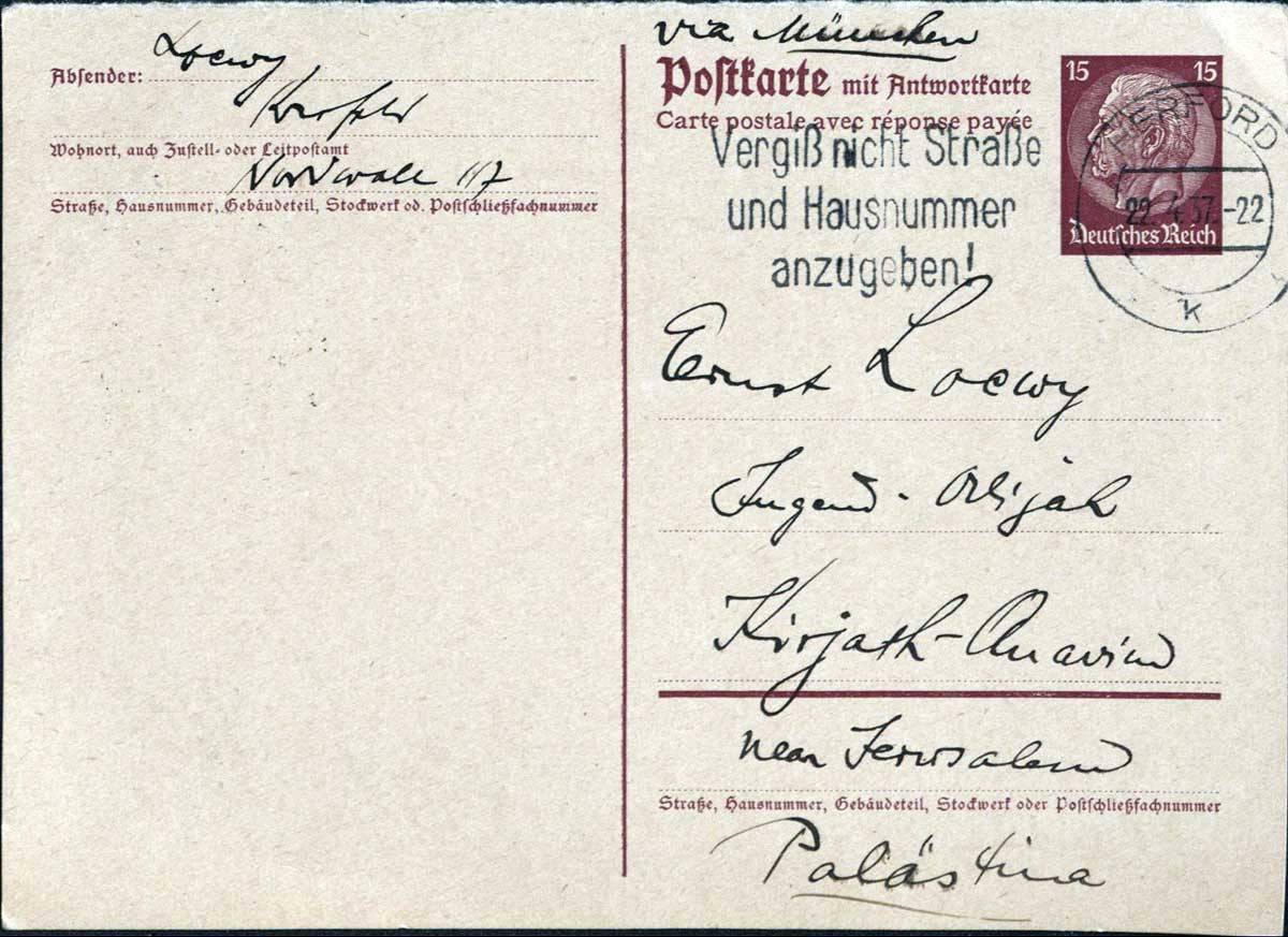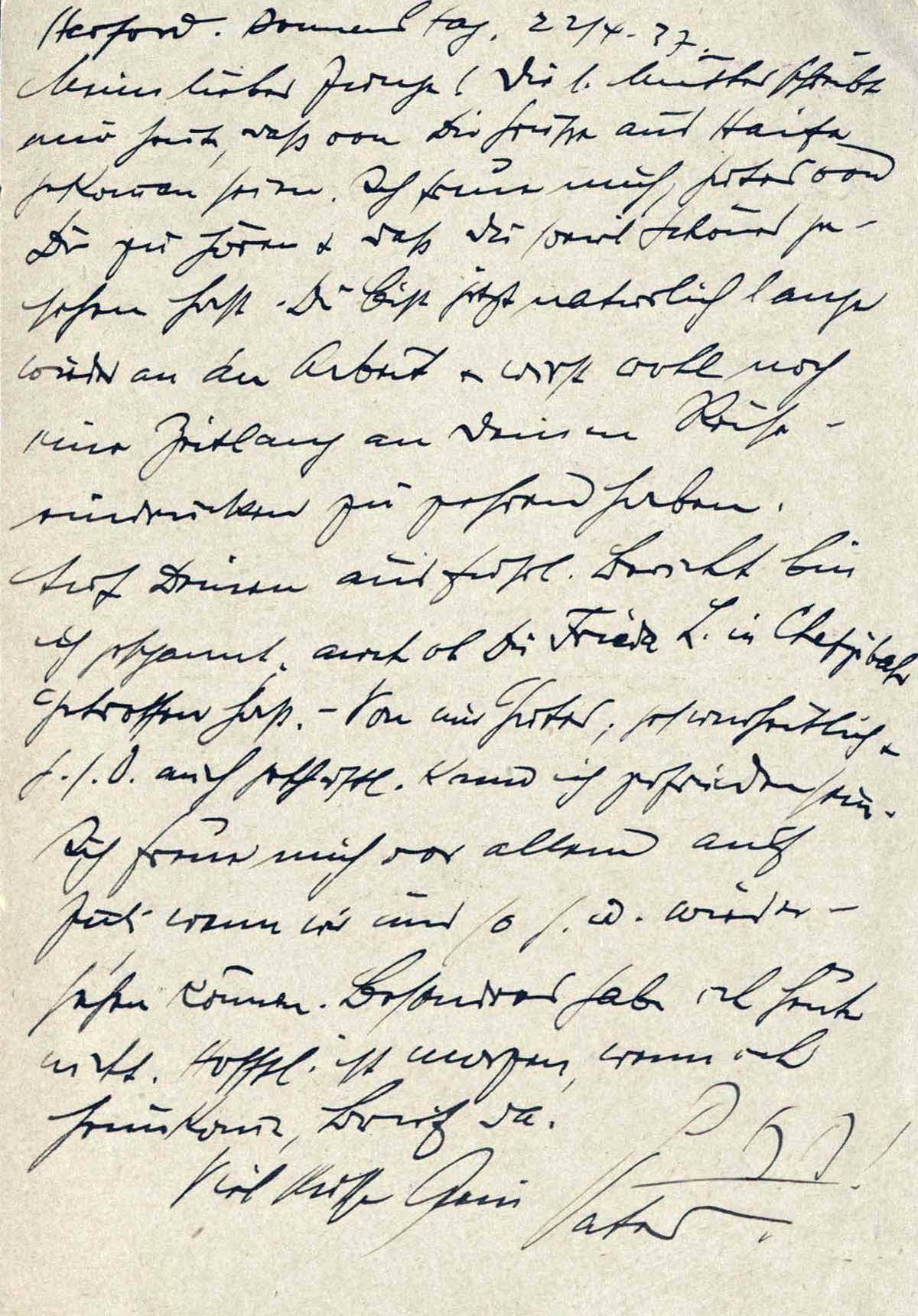 Mein lieber Junge! Die l. Mutter schreibt mir heute, daß von Dir Grüße aus Haifa gekommen seien. Ich freue mich, Gutes von Dir zu hören & daß Du soviel Schönes gesehen hast. Du bist jetzt natürlich lange wieder an der Arbeit & wirst wohl noch eine Zeitlang an Deinen Reiseeindrücken zu zehren haben.