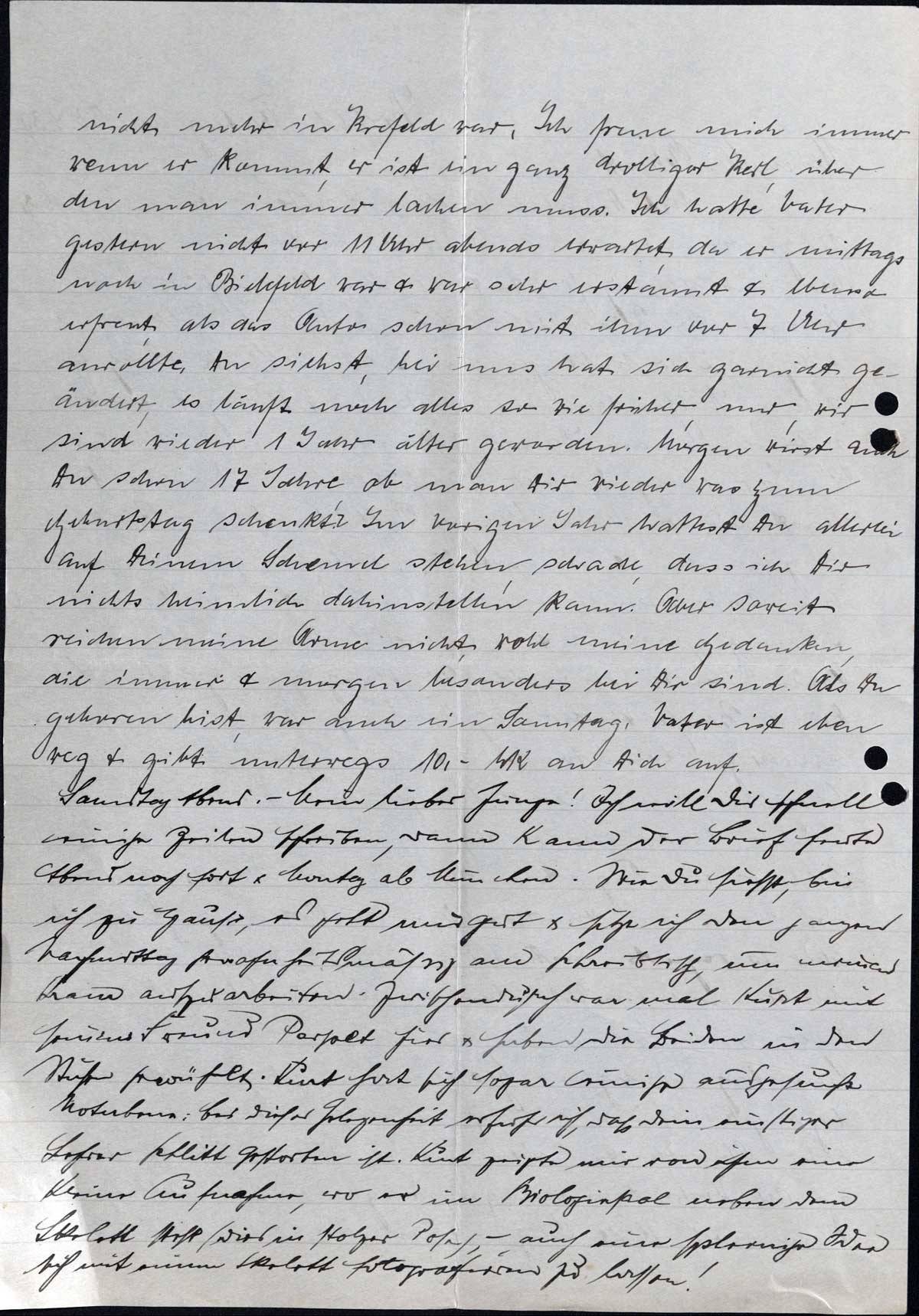 nicht mehr in Krefeld war. Ich freue mich immer, wenn er kommt, er ist ein ganz drolliger Kerl, über den man immer lachen muss. Ich hatte Vater gestern nicht vor 11 Uhr abends erwartet, da er mittags noch in Bielefeld war & war sehr erstaunt & ebenso erfreut, als das Auto schon mit ihm vor 7 Uhr anrollte. Du siehst, bei uns hat sich garnichts geändert, es läuft noch alles so wie früher, nur, wir sind wieder 1 Jahr älter geworden. Morgen wirst auch Du schon 17 Jahre, ob man Dir wieder was zum Geburtstag schenkt? Im vorigen Jahr hattest Du allerlei auf Deinem Schemel stehen, schade, dass ich Dir nichts heimlich dahinstellen kann. Aber soweit reichen meine Arme nicht, wohl meine Gedanken, die immer & morgen besonders bei Dir sind. Als Du geboren bist, war auch ein Sonntag. Vater ist eben weg & gibt unterwegs 10,- Mk an Dich auf.