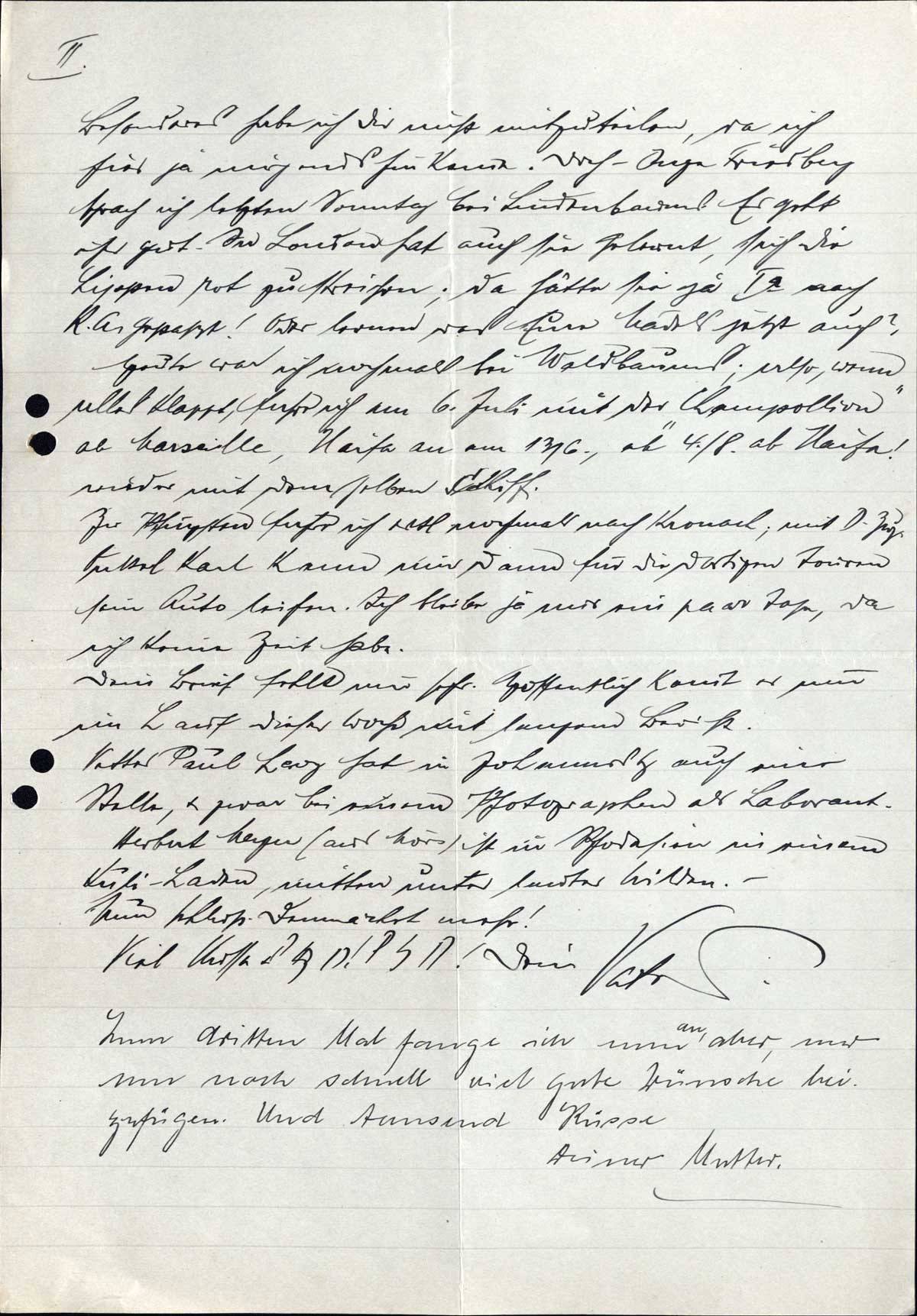 Samstag Abend. - Mein lieber Junge! Ich will Dir schnell einige Zeilen schreiben, dann kann der Brief heute Abend noch fort & Montag ab München. Wie Du siehst, bin ich zu Hause, es geht mir gut & sitze ich den ganzen Nachmittag gewohnheitsmäßig am Schreibtisch, um meinen Kram aufzuarbeiten. Zwischendurch war mal Kurt mit seinem Freund Porpet hier & haben die Beiden in den Stichen gewühlt. Kurt hat sich sogar einige ausgesucht.