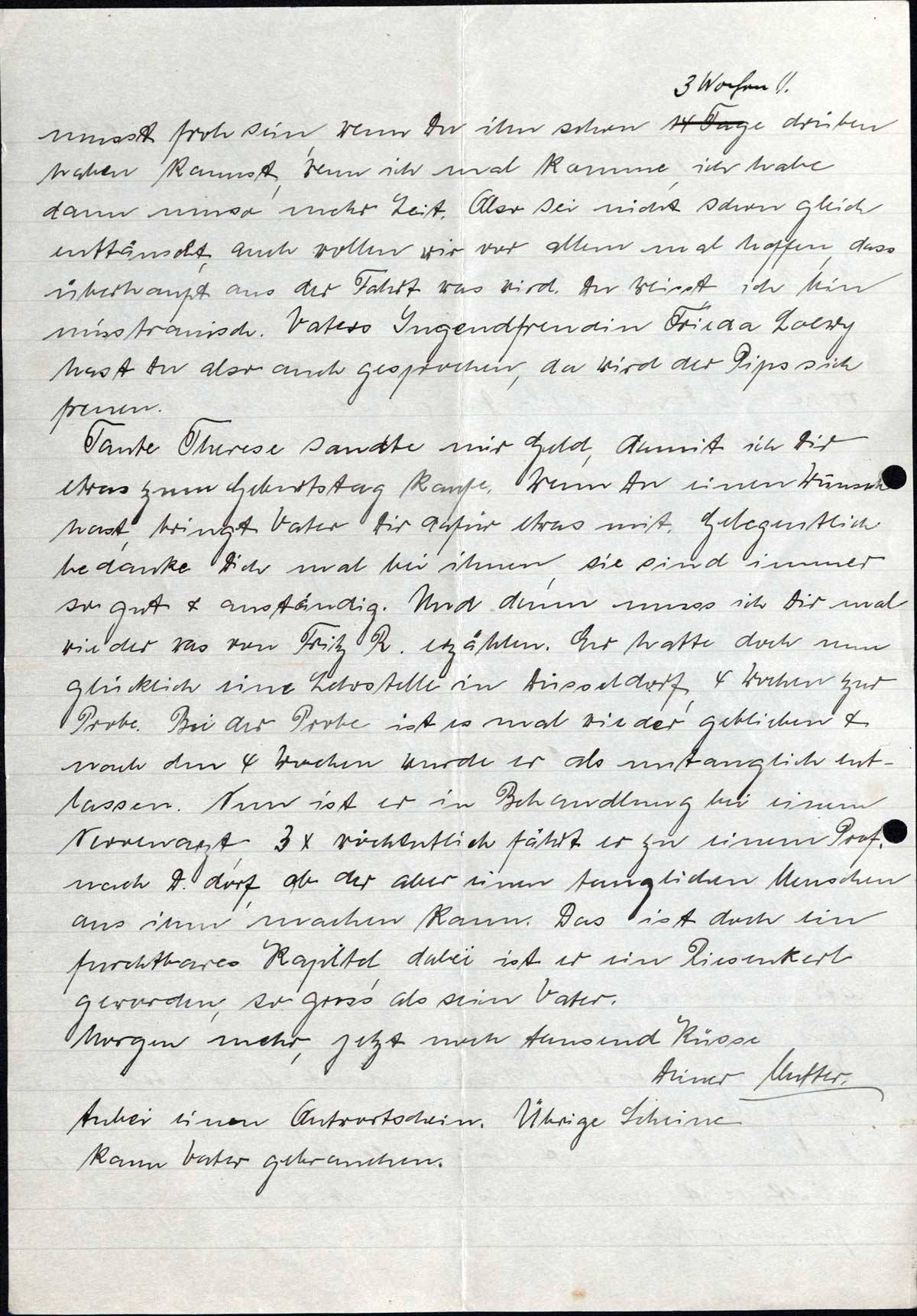 Tante Therese sandte mir Geld, damit ich Dir etwas zum Geburtstag kaufe. Wenn Du einen Wunsch hast, bringt Vater Dir dafür etwas mit. Gelegentlich bedanke Dich mal bei ihnen, sie sind immer so gut & anständig. Und dann muss ich Dir mal wieder was von Fritz R. erzählen. Er hatte doch nun glücklich eine Lehrstelle in Düsseldorf, 4 Wochen zur Probe. Bei der Probe ist es mal wieder geblieben & nach den 4 Wochen wurde er als untauglich entlassen. Nun ist er in Behandlung bei einem Nervenarzt, 3 x wöchentlich fährt er zu einem Prof. nach D.dorf, ob der aber einen tauglichen Menschen aus ihm machen kann. Das ist doch ein furchtbares Kapitel, dabei ist er ein Riesenkerl geworden, so gross als sein Vater.
