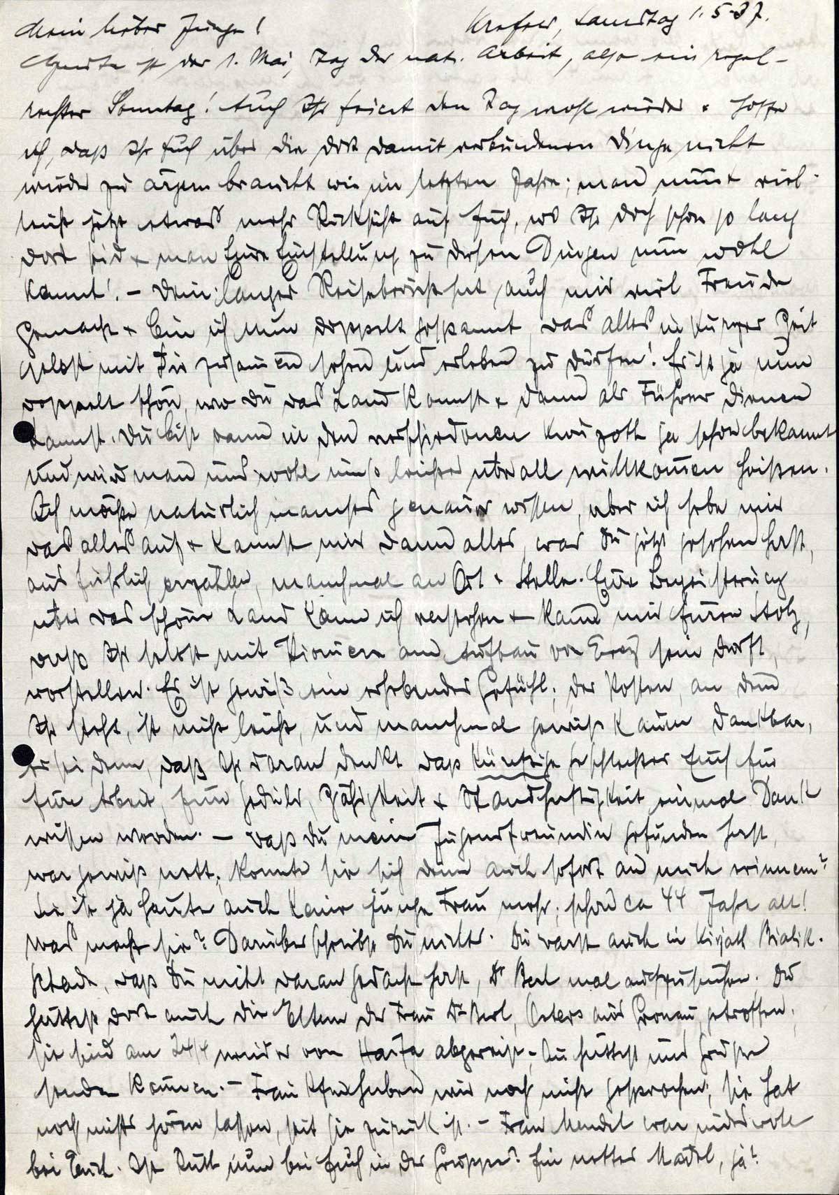 Heute ist der 1. Mai, Tag der nat. Arbeit, also ein regelrechter Sonntag! Auch Ihr feiert den Tag wohl wieder & hoffe ich, daß Ihr Euch über die dort damit verbundenen Dinge nicht wieder zu ärgern braucht wie im letzten Jahre; man nimmt vielleicht jetzt etwas mehr Rücksicht auf Euch, wo Ihr doch schon so lang dort seid & man Eure Einstellung zu diesen Dingen nun wohl kennt! - Dein langer Reisebericht hat auch mir viel Freude gemacht & bin ich nun doppelt gespannt, das alles in kurzer Zeit selbst mit Dir zusammen sehen und erleben zu dürfen! Es ist ja nun doppelt schön, wo Du das Land kennst & dann als Führer dienen kannst. Du bist dann in den verschiedenen Kwuzoth ja schon bekannt und wird man uns wohl umso leichter überall willkommen heißen. Ich möchte natürlich manches genauer wissen, aber ich hebe mir das alles auf & kannst mir dann alles, was Du jetzt gesehen hast, ausführlich erzählen, manchmal an Ort & Stelle. Eure Begeisterung über das schöne Land kann ich verstehen & kann mir Euren Stolz, daß Ihr selbst mit Pioniere am Aufbau von Erez sein dürft, vorstellen. Es ist gewiß ein erhebendes Gefühl; der Posten, an dem Ihr steht, ist nicht leicht, und manchmal gewiß kaum dankbar, es sei denn, daß Ihr daran denkt, daß künftige Geschlechter Euch für Eure Arbeit, Eure Geduld, Zähigkeit & Standhaftigkeit einmal Dank wissen werden. - Daß Du meine Jugendfreundin gefunden hast, war gewiß nett; konnte sie sich denn auch sofort an mich erinnern? Sie ist ja heute auch keine junge Frau mehr; schon ca 44 Jahre alt! Was macht sie? Darüber schreibst Du nichts. Du warst auch in Kirjath Bialik. Schade, daß Du nicht daran gedacht hast, Dr. Berl mal aufzusuchen. Du hättest dort auch die Eltern der Frau Dr. Berl, Osters aus Gronau, getroffen; sie sind am 24/4 wieder von Haifa abgereist - Du hättest uns Grüße senden können. - Frau Kfm haben wir noch nicht gesprochen; sie hat noch nichts hören lassen, seit sie zurück ist. - Frau Mendel war [..] bei Euch. Ist Ruth nun bei Euch in der Gruppe? Ein nettes Mädel, ja?
