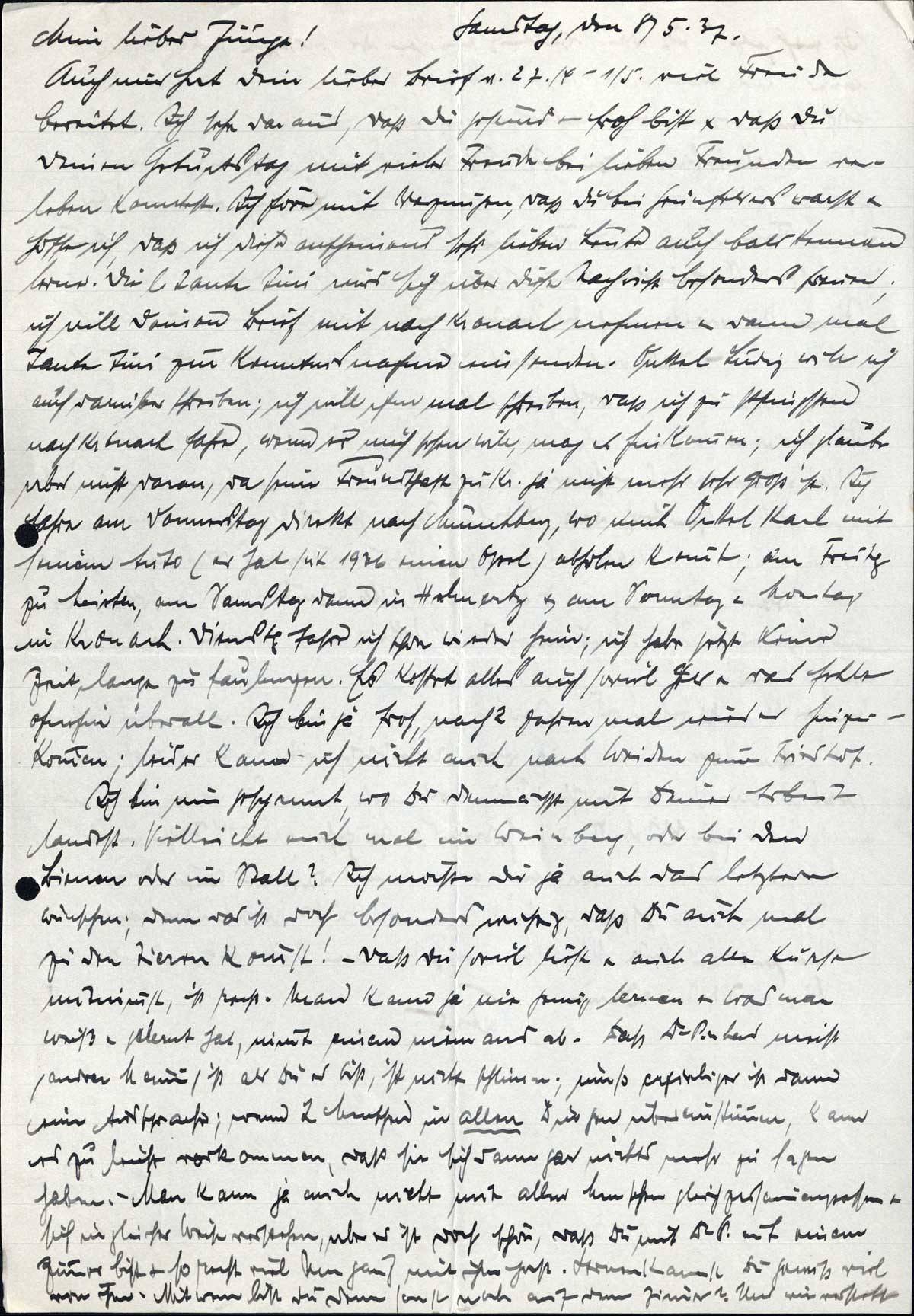 Auch mir hat Dein lieber Brief v. 27./4.-1/5. viel Freude bereitet. Ich sehe daraus, daß Du gesund & froh bist & daß Du Deinen Geburtstag mit vieler Freude bei lieben Freunden verleben konntest. Ich höre mit Vergnügen, daß Du bei Grünfelders warst & hoffe ich, daß ich diese anscheinend sehr lieben Leute auch bald kennenlerne. Die l. Tante Tini wird sich über diese Nachricht besonders freuen; ich will Deinen Brief mit nach Kronach nehmen & dann mal Tante Tini zur Kenntnisnahme einsenden. Onkel Ludwig will ich auch darüber schreiben; ich will ihm mal schreiben, daß ich zu Pfingsten nach Kronach fahre, wenn er mich sehen will, mag er hinkommen; ich glaube aber nicht daran, da seine Freundschaft zu Kr. ja nicht mehr sehr groß ist. Ich fahre am Donnerstag direkt nach Münchberg, wo mich Onkel Karl mit seinem Auto (er hat seit 1936 einen Opel) abholen kommt; am Freitag zu Meisters, am Samstag dann in Helmbrechts & am Sonntag & Montag in Kronach. Dienstag fahre ich schon wieder heim; ich habe jetzt keine Zeit, lange zu faulenzen. Es kostet alles auch soviel Geld & das fehlt ohnehin überall. Ich bin ja froh, nach 2 Jahren mal wieder hinzukommen; leider kann ich nicht auch nach Weiden zum Friedhof.
