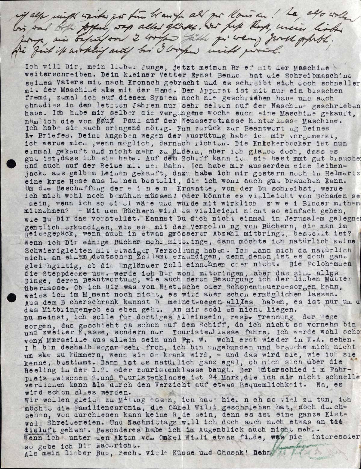 Ich will Dir, mein lieber Junge, jetzt meinen Brief mit der Maschine weiterschreiben. Dein kleiner Vetter Ernst Benno hat die Schreibmaschine seines Vaters mit nach Kronach gebracht und es schreibt sich doch schneller mit der Maschine als mit der Hand. Der Apparat ist mir nur ein bisschen fremd, zumal ich auf diesem System noch nie geschrieben habe und auch ohnedies in den letzten Jahren nur sehr selten auf der Maschine geschrieben habe. Ich habe mir selber die vergangene Woche auch eine Maschine gekauft, nämlich die von Paul auf der Neusserstrasse hinterlasse Maschine. Ich habe sie auch dringend nötig. Nun zurück zur Beantwortung Deines l. Briefes. Deine Angaben wegen der Ausrüstung habe ich mir vorgemerkt, ich werde mich, wenn möglich, darnach richten. Die Knickerbocker ist nun einmal gekauft und nicht mehr zu ändern, aber ich glaube doch, dass es gut ist, dass ich sie habe. Auf dem Schiff kann ich sie bestimmt gut gebrauchen und auch auf der Reise mit der Bahn. Ich habe mir ausserdem eine Leinenjacke aus gelbem Leinen gekauft, dazu habe ich mir gestern noch in Helmertz eine kurze Hose aus Leinen bestellt, die ich wohl auch gut gebrauchen kann. Um die Beschaffung der einen Krawatte, von der Du schreibst, werde ich mich wohl noch bemühen müssen! Oder könnte es vielleicht von Schaden sein, wenn ich so eitel wäre und würde mir wirklich zwei Binder mitnehmen? - Mit den Büchern wird es vielleicht nicht so einfach gehen, wie Du Dir das vorstellst. Kannst Du Dich nicht einmal in Jerusalem gelegentlich erkundigen, wie es mit der Verzollung von Büchern, die man im Reisegepäck, wenn auch in etwas grösserer Anzahl mitbringt, bestellt ist? Wenn ich Dir einige Bücher mehr mitbringe, dann möchte ich natürlich keine Schwierigkeiten mit etwaiger Verzollung haben. Ich kann mich da natürlich nicht an einem deutschen Zollamt erkundigen, denn denen ist es doch ganz gleichgültig, ob die Engländer Zoll einnehmen oder nicht. die Polohemden die Steppdecke usw. werde ich Dir wohl mitbringen, aber das sind alles Dinge, deren Beantwortung, wie auch deren Besorgung ich der lieben Mutter überlasse. Ob ich Dir was von Nietzsche oder Schoppenhauer besorgen kann, weiss ich im Moment noch nicht, es wird aber schon ermöglichen lassen. Aus dem Bücherschrank kannst Du meinetwegen alles haben, es ist nur um das Mitbringen, ob es eben geht. An mir soll es nicht liegen.