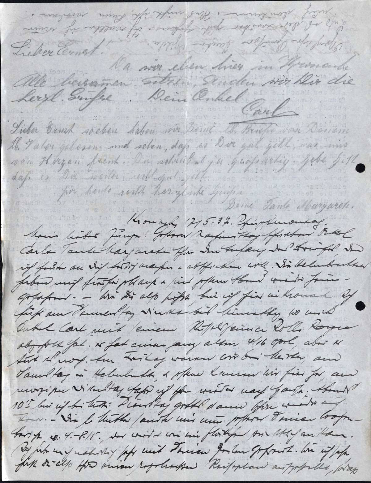 Mein lieber Junge! Gestern Nachmittag schrieben Onkel Carl & Tante Margarete schon den Anfang des Briefes, den ich heute an Dich fertig machen & abschicken will. Die Helmbrechter haben micht früher gebracht & sind gestern Abend wieder heimgefahren. - Wie Du also siehst, bin ich hier in Kronanch. Ich fuhr am Donnerstag [..] bis Münchberg, wo mich Onkel Carl mit seinem Rüsselheimer Rolls Royce abgeholt hat; er hat einen ganz alten 4/16 Opel, aber er tut es noch. Am Freitag waren wir bei Meister, am Samstag in Helmbrachts, & gestern kamen wir hier her, am morgigen Dienstag fahre ich schon wieder nach Hause. Abends 10.15 bin ich bei Mutti. Dienstag gehts dann schon wieder auf Tour. - Die l. Mutter sandte mir nun gestern Deinen Wochenbericht, v. 4.-8/5., der wieder wie ein [..] ankam. Ich habe mich natürlich sehr mit Deinen Zeilen gefreut. Wie ich sehe, hast Du also schon einen regelrechten Reiseplan aufgestellt, sodaß