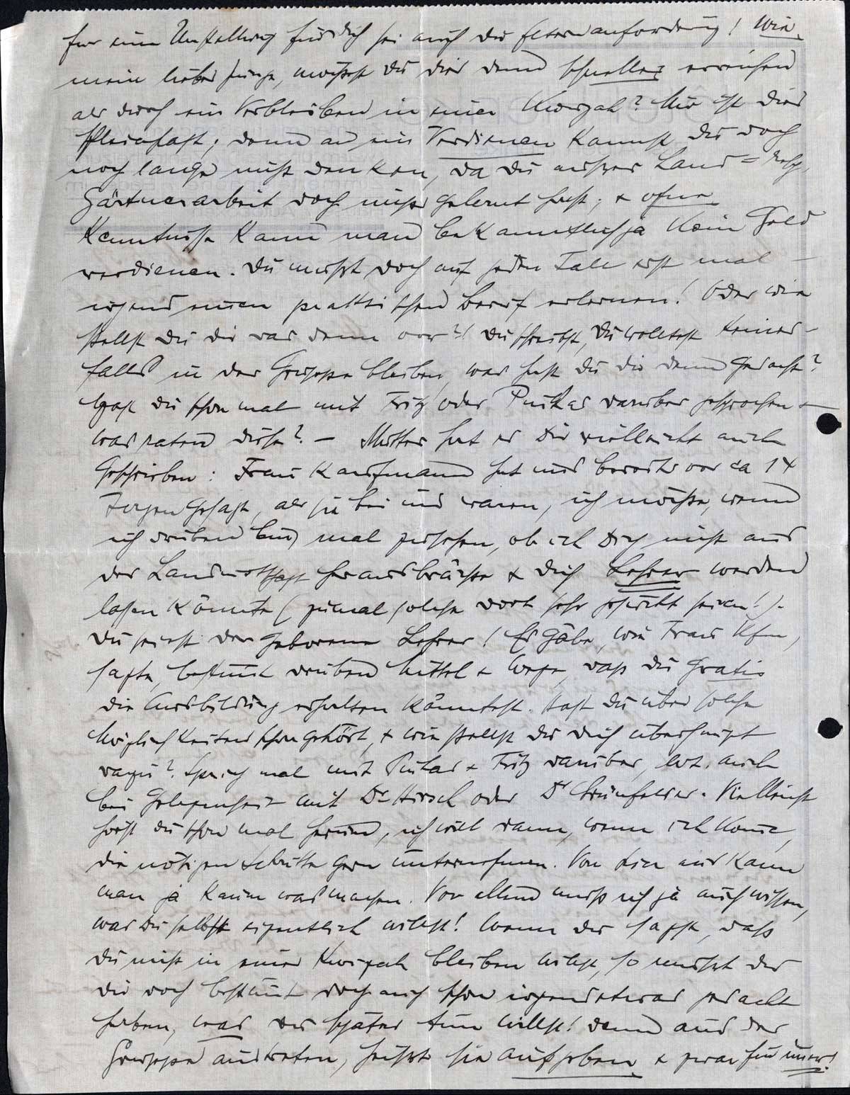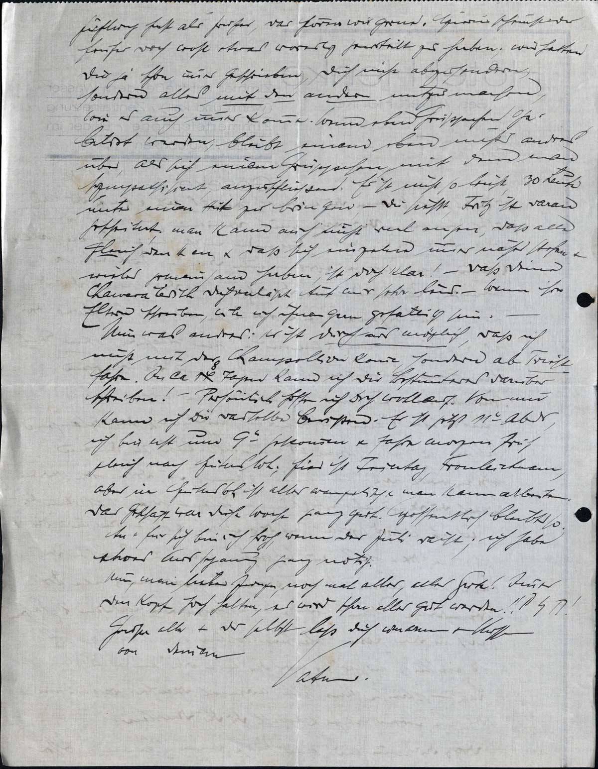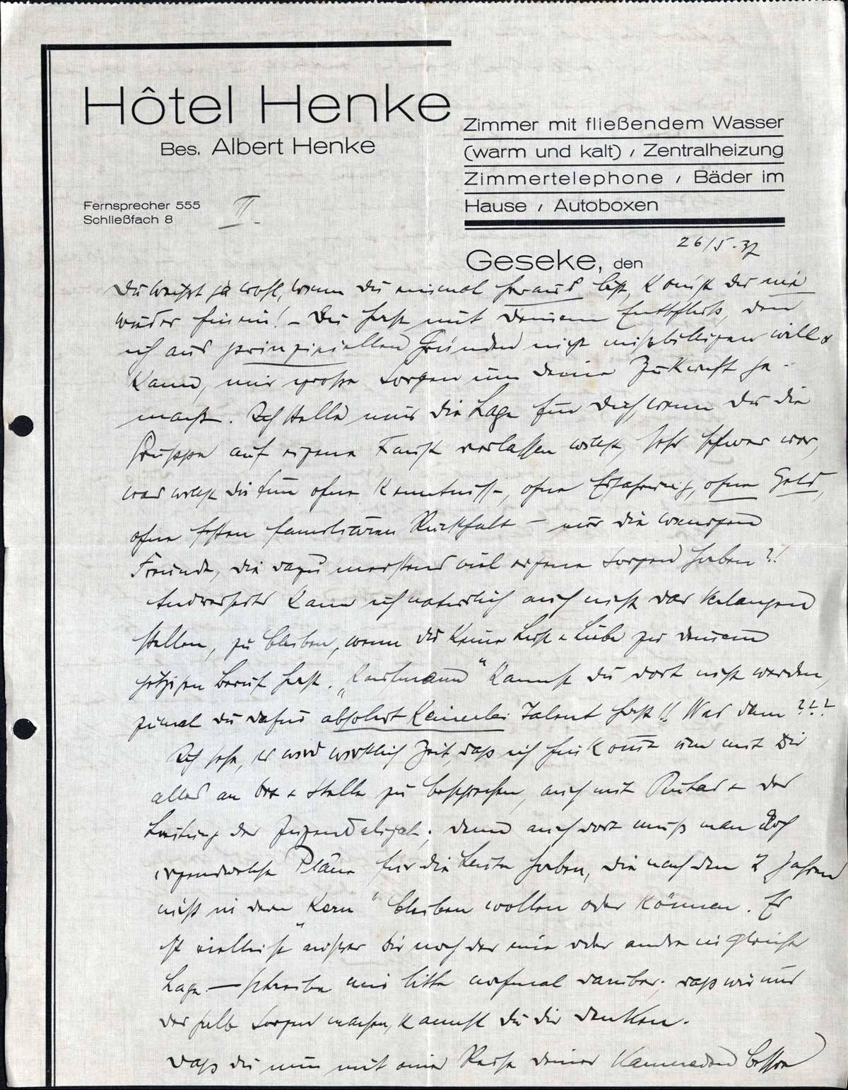 Nun was andres: es ist durchaus möglich, daß ich nicht mit der Champollion komme, sondern ab Triest fahre. In ca 8 Tagen kann ich Dir Bestimmteres darüber schreiben! - Persönlich hoffe ich Dich wohlauf. Von mir kann ich Dir dasselbe berichten. Es ist jetzt 11 Uhr abends, ich bin erst um 9 h gekommen & fahre morgen früh gleich nach Gütersloh; hier ist Feiertag, Fronleichnam, aber in Gütersloh ist alles evangelisch & man kann arbeiten. Das Geschäft war diese Woche ganz gut. Hoffentlich bleibts so.