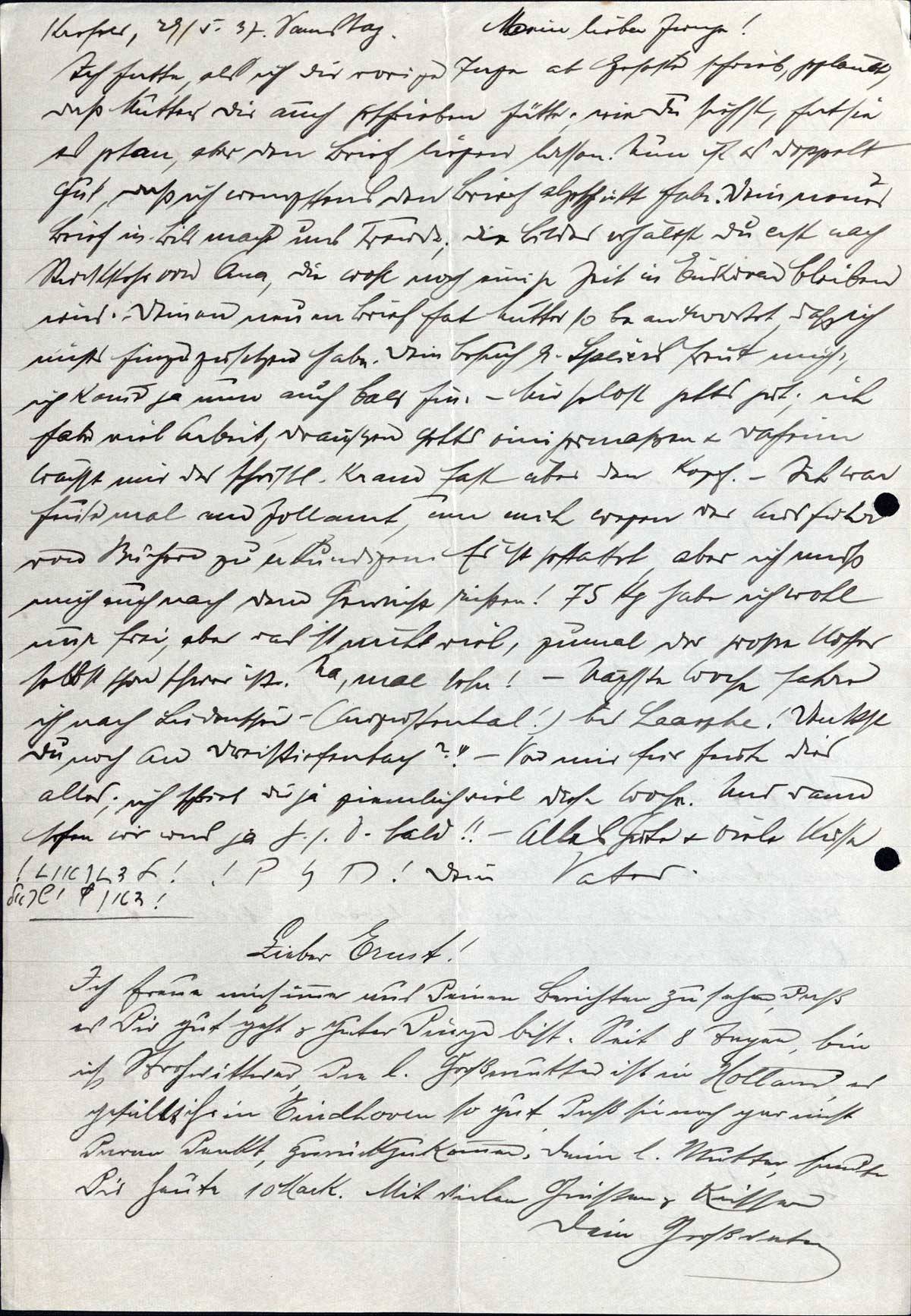 Ich freue mich immer mit Deinen Berichten zu sehen, daß es Dir gut geht & guter Dinge bist. Seit 8 Tagen bin ich Strohwittwer, die l. Großmutter ist in Holland, es gefällt ihr in Eindhoven so gut. Daß sie noch gar nicht daran denkt, zurückzukommen. Deine l. Mutter sandte Dir heute 10 Mark. Mit vielen Grüßen & Küssen