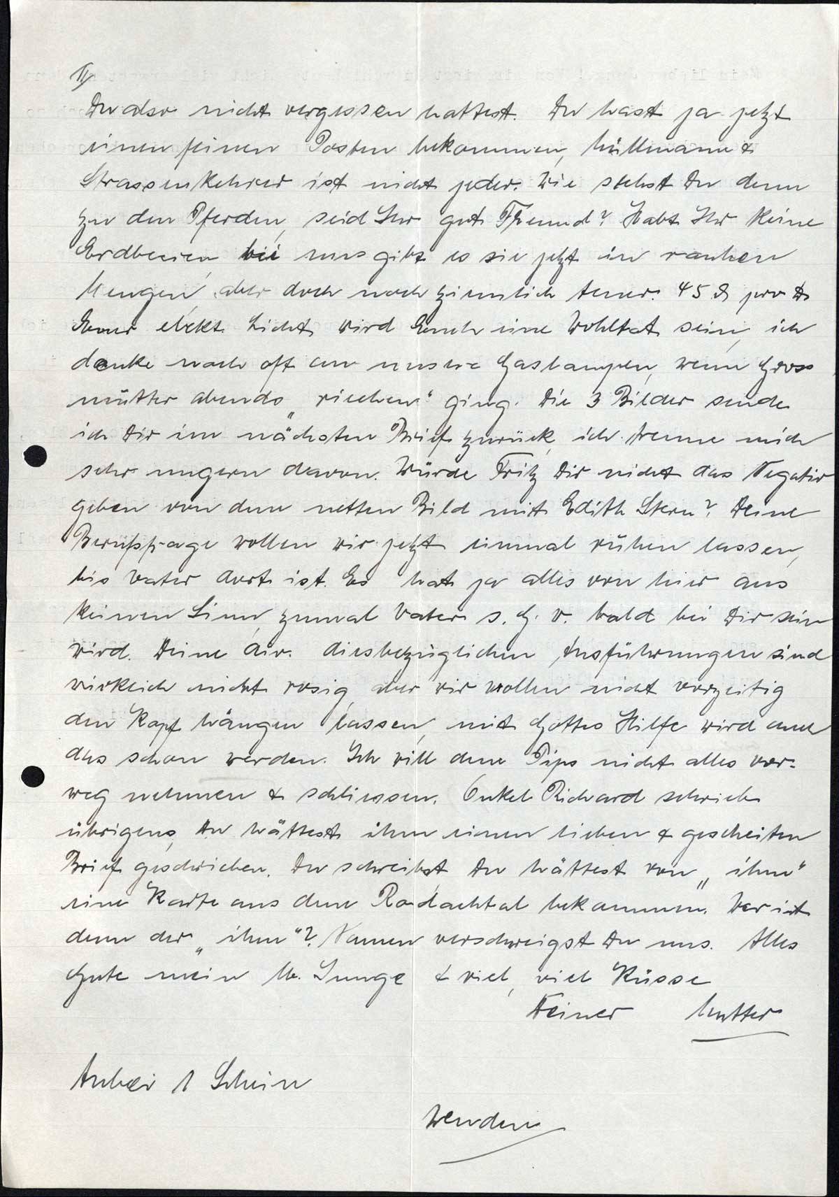 Du also nicht vergessen hattest. Du hast ja jetzt einen feinen Posten bekommen, Müllmann & Strassenkehrer ist nicht jeder. Wie stehst Du denn zu den Pferden, seid Ihr gut Freund? Habt Ihr keine Erdbeeren, bei uns gibt es sie jetzt in rauhen Mengen, aber doch noch ziemlich teuer 45 Pf. pro Pfd. Euer elektr. Licht wird Euch eine Wohltat sein, ich denke noch oft an unsere Gaslampen, wenn Grossmutter abends „riechen” ging. Die 3 Bilder sende ich Dir im nächsten Brief zurück, ich trenne mich sehr ungern davon. Würde Fritz Dir nicht das Negativ geben von dem netten Bild mit Edith Stein? Deine Beurfsfrage wollen wir jetzt einmal ruhen lassen, bis Vater dort ist. Es hat ja alles von hier aus keinen Sinn, zumal Vater s. G. w. bald bei Dir sein wird. Deine div. diesbezüglichen Ausführungen sind wirklich nicht rosig, aber wir wollen nicht vorzeitig den Kopf hängen lassen, mit Gottes Hilfe wird auch das schon werden. Ich will dem Pips nicht alles vorweg nehmen & schliessen. Onkel Richard schreib übrigens, Du hättest ihm einen lieben & gescheiten Brief geschrieben. Du schreibst, Du hättest von „ihm” eine Karte aus dem Rodachtal bekommen. Wer ist denn der „ihm”? Namen verschweigst Du uns. Alles Gute mein lb. Junge & viel, viel Küsse