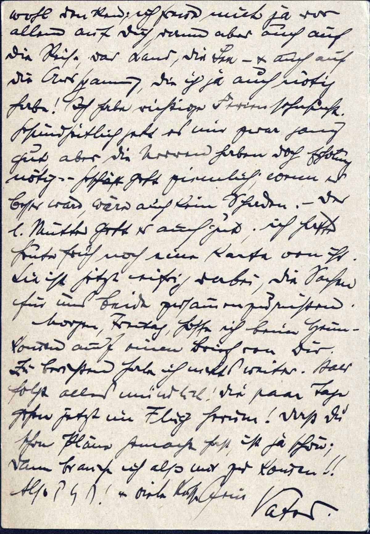 Morgen, Freitag, hoffe ich beim Heimkommen auf einen Brief von Dir. Zu berichten habe ich nichts weiter. Bald folgt alles mündlich! Die paar Tage gehen jetzt im Flug herum! Daß Du schon Pläne gemacht hast, ist ja schön; dann brauche ich also nur zu kommen!!