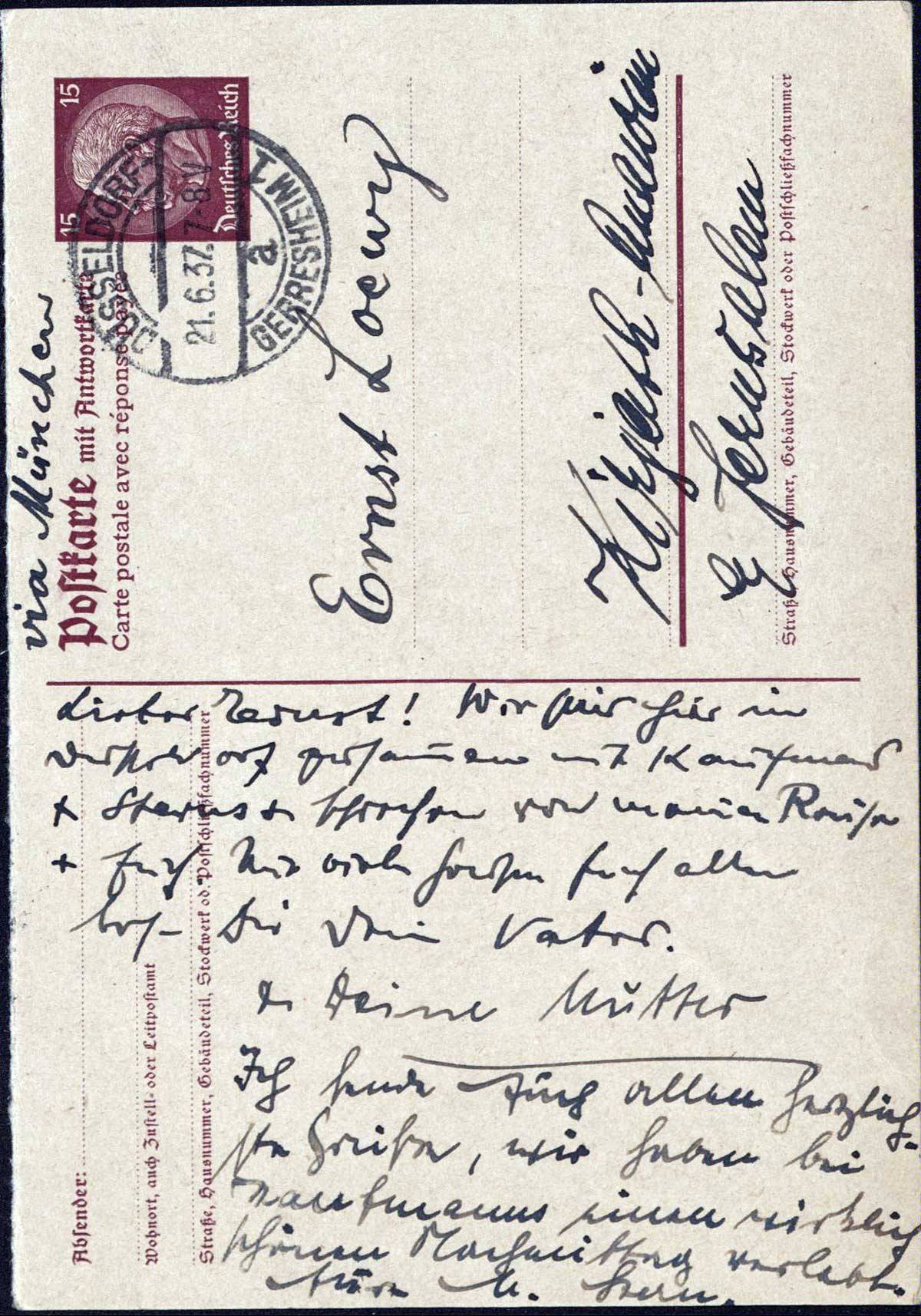 Lieber Ernst! Wir sind hier in Düsseldorf zusammen mit Kaufmanns & Sterns & sprechen von meiner Reise & Euch. Mit vielen Grüßen Euch allen bes. Dir Dein Vater.
