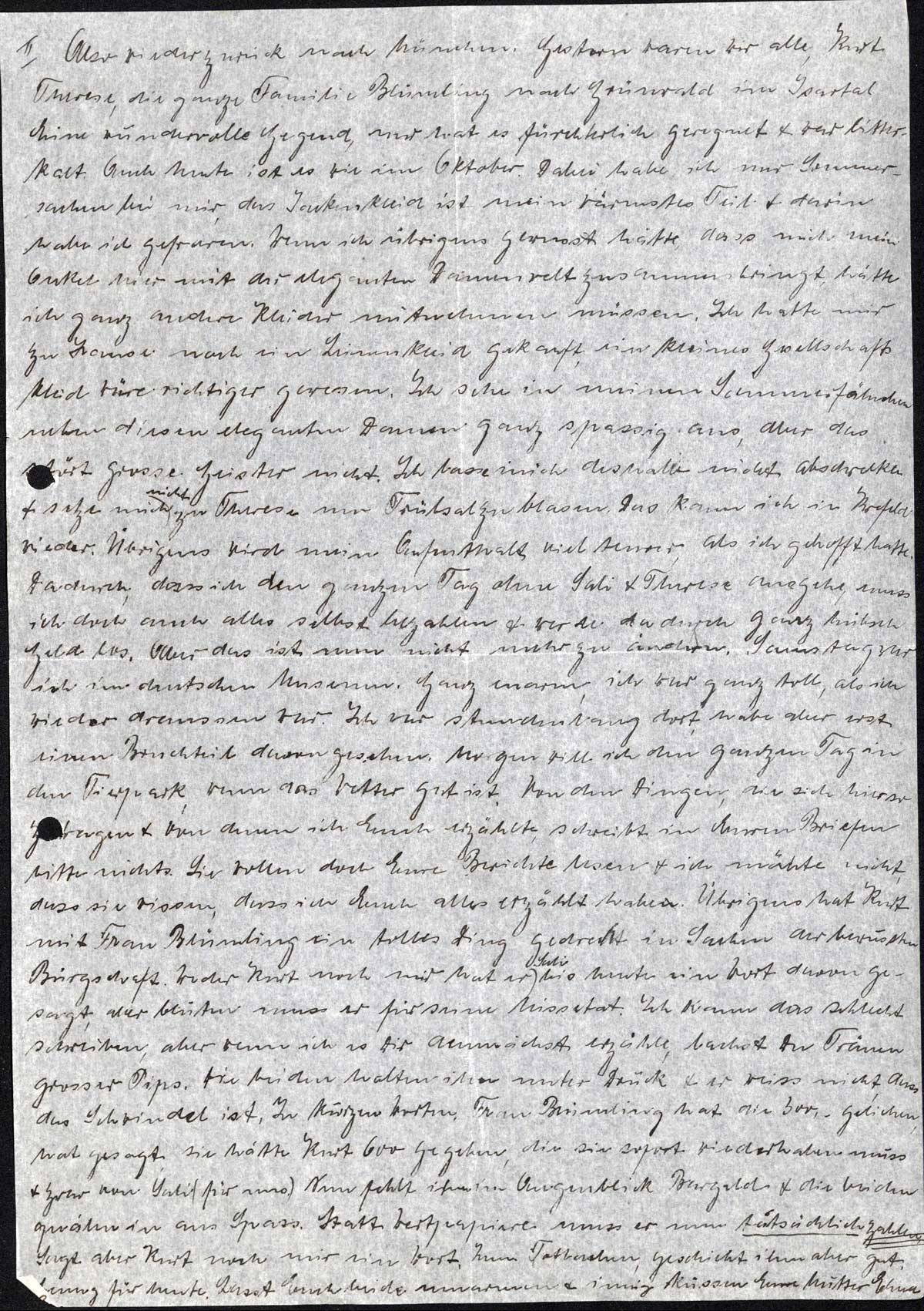 Also wieder zurück nach München. Gestern waren wir alle, Kurt, Therese, die ganze Familie Blümling nach Grünwald im Isartal. Eine wundervolle Gegend, nur hat es fürchterlich geregnet & war bitterkalt. Auch heute ist es wie im Oktober. Dabei habe ich nur Sommersachen bei mir, das Jackenkleid ist mein wärmstes Teil & darin habe ich gefroren. Wenn ich übrigens gewusst hätte, dass mich mein Onkel hier mit der eleganten Damenwelt zusammen bringt, hätte ich ganz andere Kleider mitnehmen müssen. Ich hatte mir zu Hause noch ein Leinenkleid gekauft, ein kleines Gesellschaftskleid wäre richtiger gewesen. Ich sehe in meinem Sommerfähnchen neben diesen eleganten Damen ganz spassig aus, aber das stört grosse Geister nicht. Ich lasse mich deshalb nicht abschrecken & setze mich nicht zu Therese um Trübsal zu blasen. Das kann ich in Krefeld wieder. Übrigens wird mein Aufenthalt viel teurer, als ich gehofft hatte. Dadurch, dass ich den ganzen Tag ohne Sali & Therese ausgehe, muss ich doch auch alles selbst bezahlen & werde dadurch ganz hübsch Geld los. Aber das ist nun nicht mehr zu ändern. Samstag war ich im deutschen Museum. Ganz enorm, ich war ganz toll, als ich wieder draussen war. Ich war stundenlang dort, habe aber erst einen Bruchteil davon gesehen. Morgen will ich den ganzen Tag in den Tierpark, wenn das Wetter gut ist. Von den Dingen, die sich hier so zutragen & von denen ich Euch erzählte, schreibt in Euren Briefen bitte nichts. Sie wollen doch Eure Berichte lesen & ich möchte nicht, dass sie wissen, dass ich Euch alles erzählt habe. Übrigens hat Kurt mit Frau Blümling ein tolles Ding gedreht in Sachen der bewussten Bürgschaft. Weder Kurt noch mir hat er Sali bis heute ein Wort davon gesagt, aber bluten muss er für seine Missetat. Ich kann das schlecht schreiben, aber wenn ich es Dir demnächst erzähle, lachst Du Tränen, grosser Pips. Die beiden halten ihn unter Druck & er weiss nicht, dass das Schwindel ist. In kurzen Worten, Frau Blümling hat die 300,- geliehen, hat gesagt, sie hätte Kurt 600 gegeben, die sie sofort wiederhaben muss & zwar von Sali für uns.) Nun fehlt ihm im Augenblick Bargeld & die beiden quälen in aus Spass. Statt Wertpapiere muss er nun tatsächlich zahlen. Sagt aber Kurt noch mir ein Wort. Zum Totlachen, geschieht ihm aber gut. Genug für heute. Lasst Euch beide umarmen & innig küssen Eure Mutter Erna.