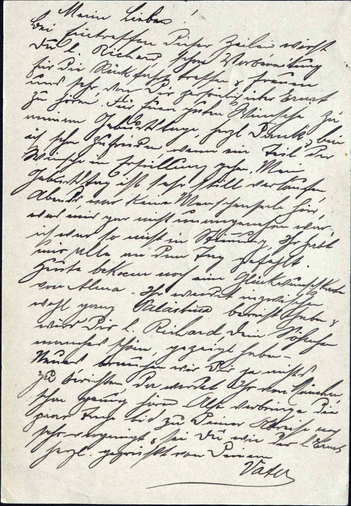 Heute bekam noch eine Glückwunschkarte von Alma. Ihr werdet inzwischen wohl ganz Palästina bereist haben & wird Dir l. Richard, Dein Söhnchen manches schöne, gezeigt haben.