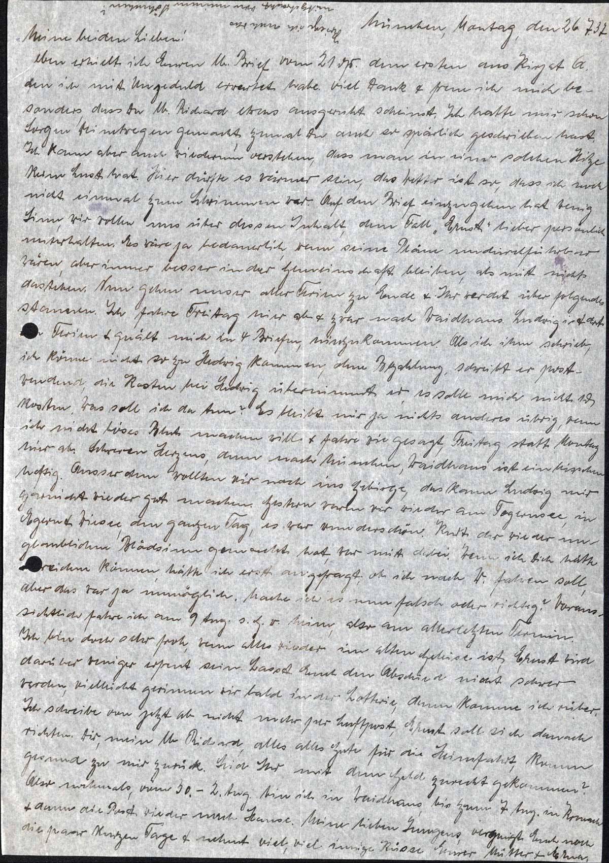 eben erhielt ich Euren lb. Brief vom 21. ds. dem ersten aus Kirjat A. den ich mit Ungeduld erwartet habe. Viel Dank & freue ich mich besonders, dass Du lb. Richard etwas ausgeruht scheinst. Ich hatte mir schon sorgen Deinetwegen gemacht, zumal Du auch so spärlich geschrieben hast. Ich kann aber auch wiederum verstehen, dass man in eine solchen Hitze keine Lust hat. Hier dürfte es wärmer sein, das Wetter ist so, dass ich noch nicht einmal zum Schwimmen war. Auf den Brief einzugehen hat wenig Sinn, wir wollen uns über dessen Inhalt, dem Fall „Ernst” lieber persönlich unterhalten. Es wäre ja bedauerlich, wenn seine Pläne undurchführbar wären, aber immer besser in der Gemeinschaft bleiben, als mit nichts dastehen. Nun gehen unser aller Ferien zu Ende & Ihr werdet über folgendes staunen. Ich fahre Freitag hier ab & zwar nach Waidhaus. Ludwig ist dort in Ferien & quält mich in 4 Briefen, hinzukommen. Als ich ihm schrieb, ich könne nicht so zu Hedwig kommen, ohne Bezahlung, schreibt er postwendend, die Kosten bei Hedwig übernimmt er, es solle mich nicht 1 Pf. kosten. Was soll ich da tun? Es bleibt mir ja nichts anderes übrig, wenn ich nicht böses Blut machen will & fahre wie gesagt, Freitag statt Montag hier ab. Schweren Herzens, denn nach München, Waidhaus ist ein bisschen heftig. Ausserdem wollten wir noch ins Gebirge, das kann Ludwig mir garnicht wieder gut machen. Gestern waren wir wieder am Tegernsee, in Egern & Wiesee, den ganzen Tag, es war wunderschön. Kurt, der wieder unglaublichen Blödsinn gemacht hat, war mit dabei. Wenn ich Dich hätte erreichen können, hätte ich erst angefragt, ob ich nach W. fahren soll, aber das war ja unmöglich. Mache ich es nun falsch oder richtig? Voraussichtlich fahre ich am 9. Aug. s. G. w. heim, also am allerletzten Termin. Ich bin doch sehr froh, wenn alles wieder im alten Geleise ist; Ernst wird darüber weniger erfreut sein. Lasst Euch den Abschied nicht schwer werden, vielleicht gewinnen wir bald in der Lotterie, dann komme ich rüber. Ich schreibe von jetzt ab nicht mehr per Luftpost, Ernst soll sich danach richten. Dir, mein lb. Richard, alles alles Gute für die Heimfahrt, komme gesund zu mir zurück. Seid Ihr mit dem Geld zurecht gekommen? Also nochmals, vom 30.-2. Aug. bin ich in Waidhaus bis zum 7. Aug. in Kronach & dann die Post wieder nach Hause. Meine lieben Jungens, vergnügt Euch noch die paar kurzen Tage & nehmt viel, viel innige Küsse