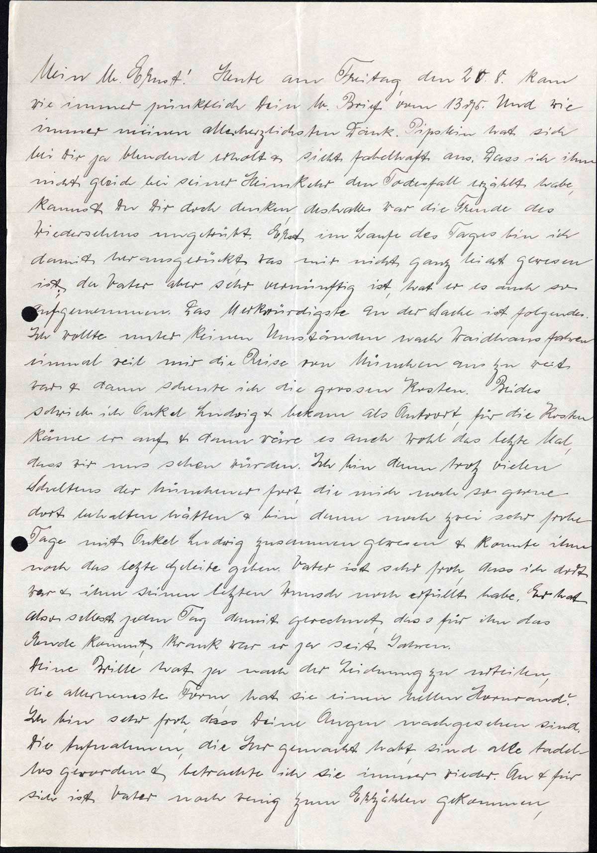 Mein lb. Ernst! Heute am Freitag, den 20.8. kam wie immer pünktlich Dein lb. Brief vom 13.ds. Und wie immer meinen allerherzlichsten Dank. Pipslein hat sich bei Dur ja blendend erholt & sieht fabelhaft aus. Dass ich ihm nicht gleich bei seiner Heimkehr den Todesfall erzählt habe, kannst Du Dir doch denken, deshalb war die Freude des Wiedersehens ungetrübt. Erst im Laufe des Tages bin ich damit herausgerückt, was mir nicht ganz leicht gewesen ist; da Vater aber sehr vernünftig ist, hat er es auch so aufgenommen. Das Merkwürdigste an der Sache ist folgendes. Ich wollte unter keinen Umständen nach Waidhaus fahren, einmal weil mir die Reise von München aus zu weit war & dann scheute ich die grossen Kosten. Beides schrieb ich Onkel Ludwig & bekam als Antwort, für die Kosten käme er auf & dann wäre es auch wohl das letzte Mal, dass wir uns sehen würden. Ich bin dann trotz vielen Scheltens der Münchener fort, die mich noch so gerne dort behalten hätten & bin dann noch zwei sehr frohe Tage mit Onkel Ludwig zusammengewesen & konnte ihm noch das letzte Geleite geben. Vater ist sehr froh, dass ich dort war & ihm seinen letzten Wunsch noch erfüllt habe. Er hat also selbst jeden Tag damit gerechnet, dass für ihn das Ende kommt; krank war er ja seit Jahren.