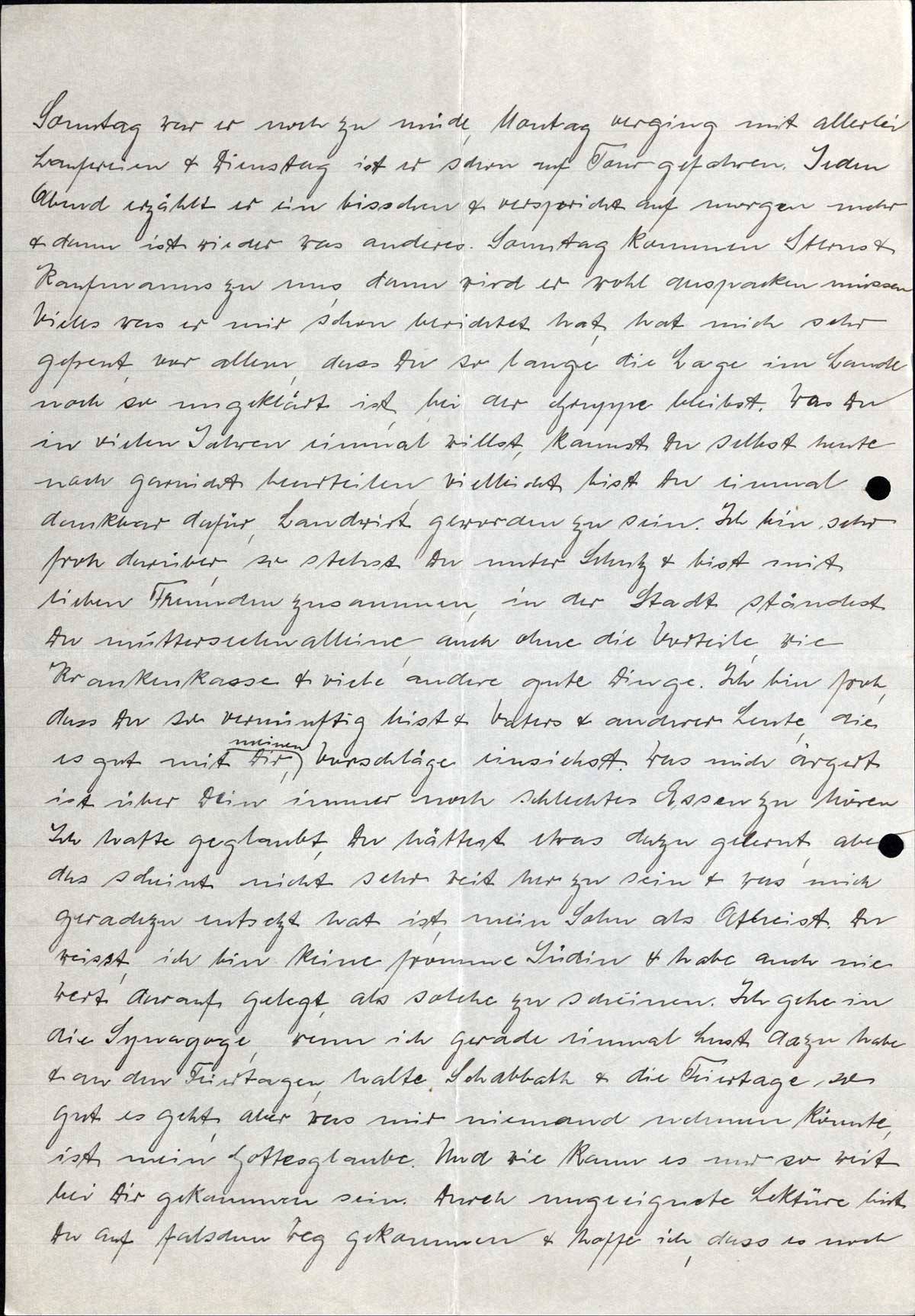 schönen Heimfahrt erzählen; auch von der Ausstellung u.s.f. - Hier ist alles beim alten. Heute früh war ich in der Synagoge & bin natürlich auf[..] worden. Trotzdem habe ich Dir ein Mischeberach machen lassen & ich hoffe, daß des Vater Segen auch Dir Häuser bauen wird. Daß Du in dieser Hinsicht auch Deiner Mutter Sorgen machst, siehst Du nun wohl! Und ich wiederhole Dir: Dein Weg ist falsch! (Trotzdem ich Dir das heute als gereifter Mann sage, so muß ich Dir zugeben, daß ich in Deinem Alter auch ähnliche falsche Wege gegangen bin; - & gerade deshalb hoffe ich, daß auch Du den Weg zurück (oder besser: weiter!) finden wirst!)